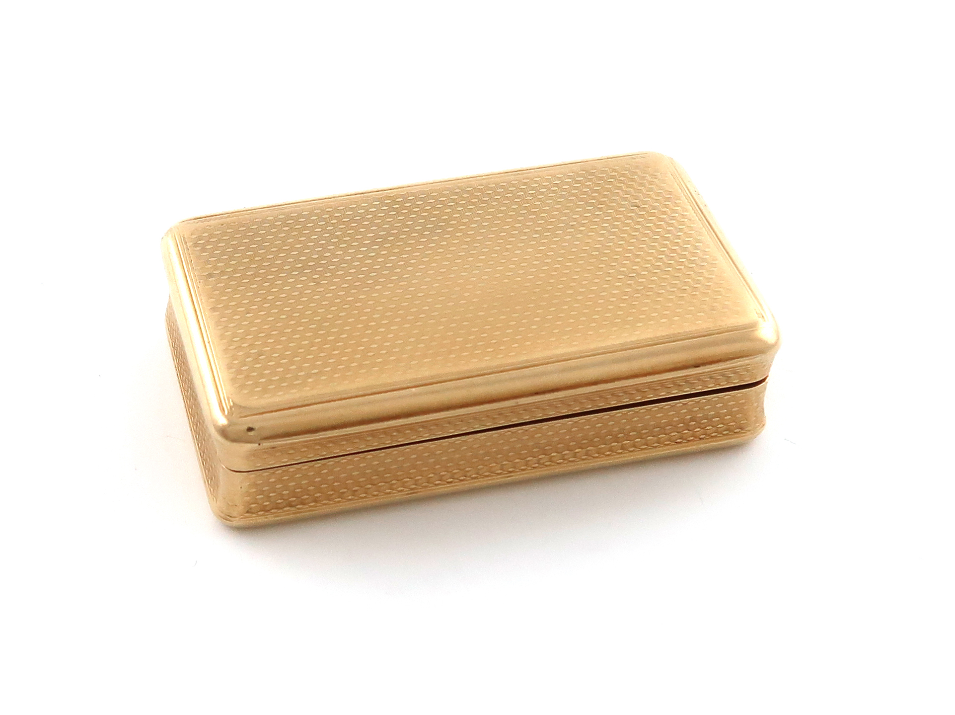 rectangular form, engine-turned decoration, the interior of the cover with an inscription, length 7.5cm, approx. weight 100.5g.