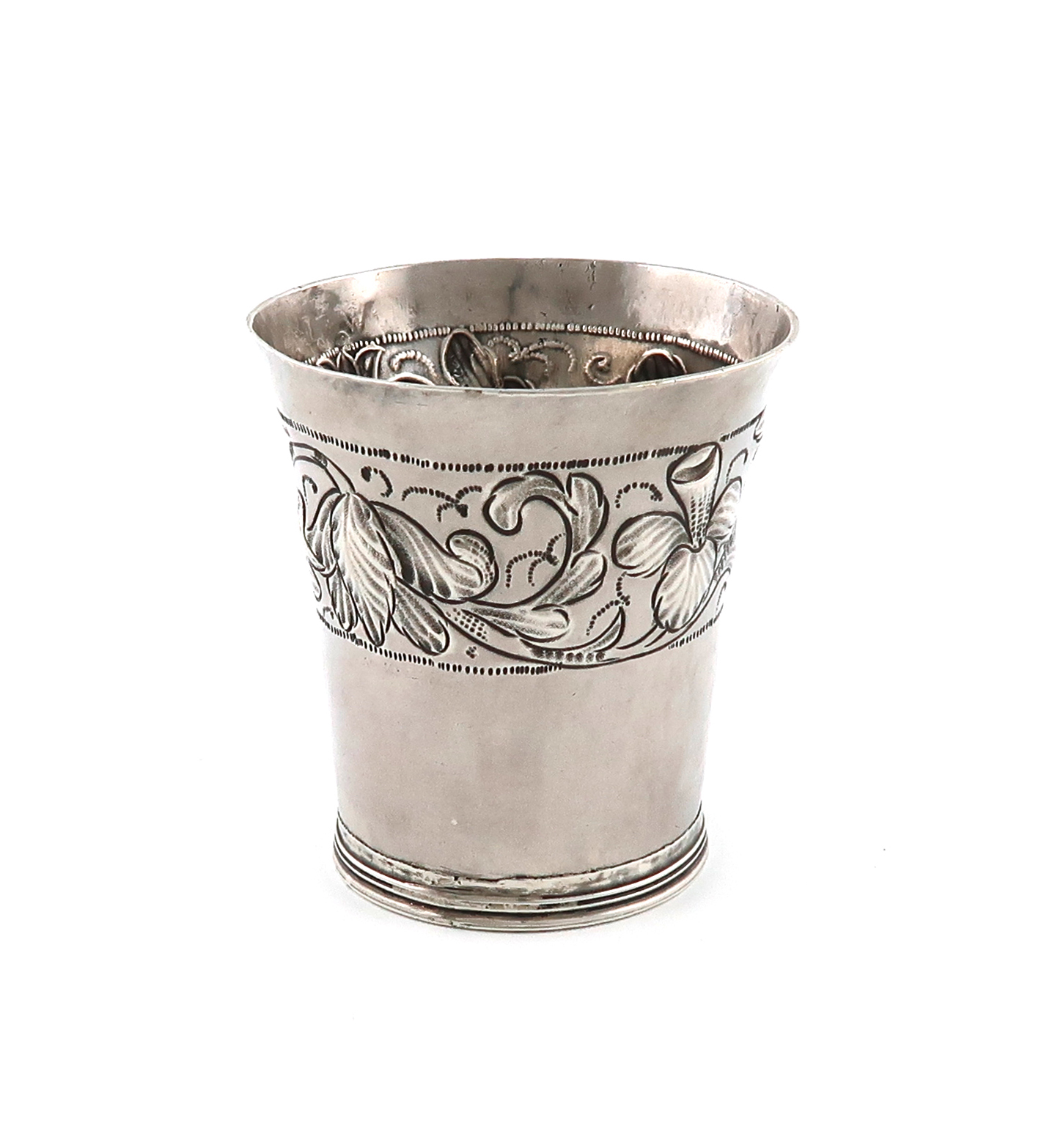tapering circular form, embossed with a band of foliate decoration, on a circular foot, prick-dot initialled 'P' over 'W.I' over '1690', height 8cm, approx. weight 3oz.