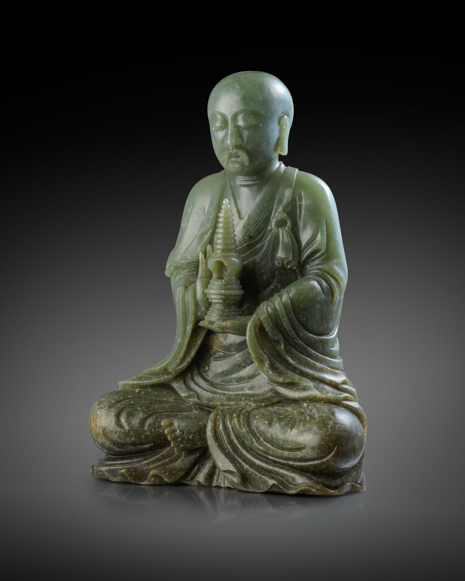 Carved seated in dhyanasana wearing a shawl and long robes, his garments held by a clasp at his left shoulder, he holds a stupa in his left hand whilst raising his right hand behind the precious object in a variation of abhaya mudra, his serene face detailed with a small finely incised moustache and beard, the green stone with brown flecks and inclusions, 23.5cm.