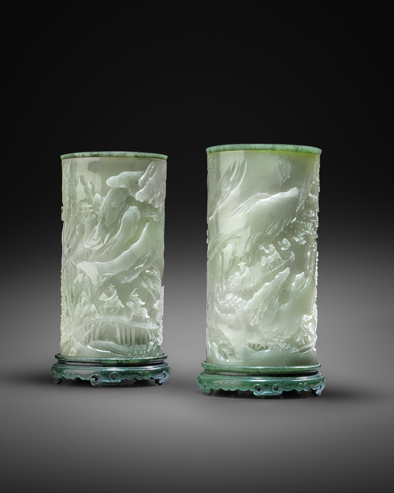 The tall cylindrical bodies carved in pale celadon jade with mountainous landscapes, the continuous scenes depicting figures engaged in various activities, including travellers on horseback crossing bridges and woodcutters returning from the forest, with thatched pavilions and temples dispersed through the rocky setting, with far-off peaks emerging from swirls of mist in the distance, the rims applied with spinach-green jade, each together with a spinach-green jade stand carved with five feet shaped as ruyi-heads, the stands pierced with floral medallions, 14cm. (4)