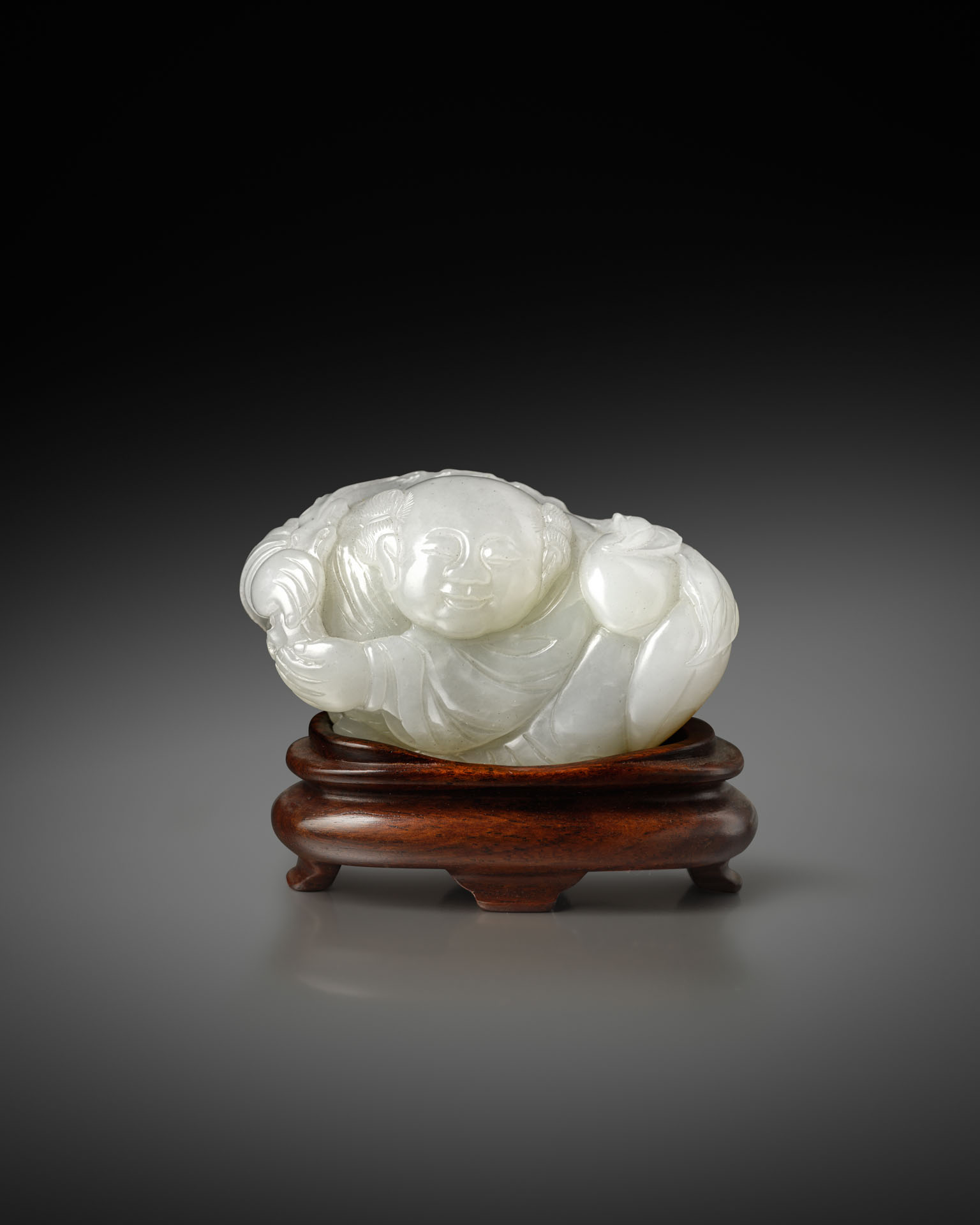 Children are one of the most popular subjects in Chinese art, and they are often portrayed holding plants. Representations of young boys holding leafy branches appeared in jade carvings as early as the Song dynasty and, whilst the subject matter varies, they are often depicted with branches of lotus rather than peaches. As peaches are believed to be the food of the Immortals, and thus a symbol of longevity, this may suggest that the present figure was intended as a birthday gift.