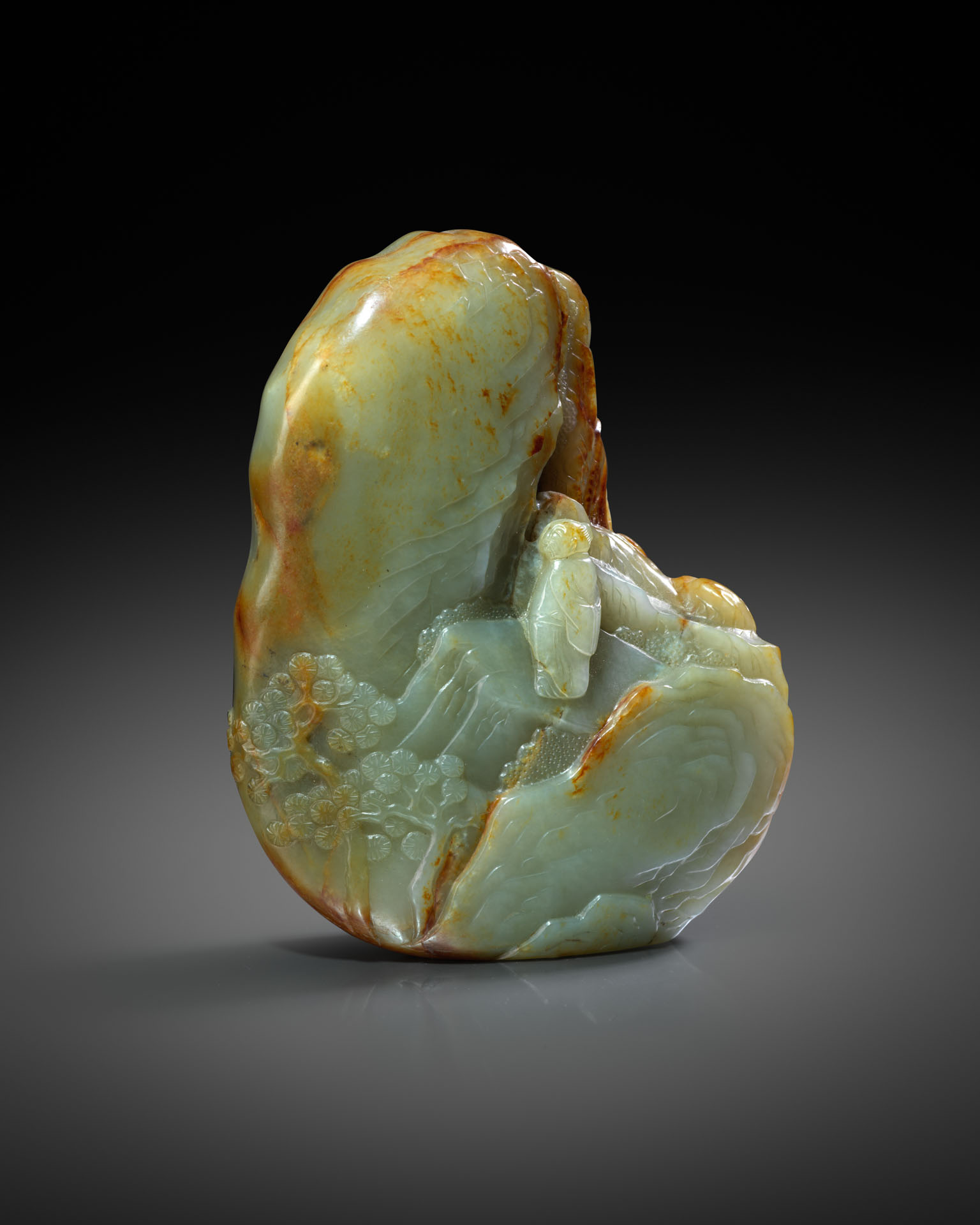 The subject on this carving is inspired by traditional Chinese landscape painting. The Chinese word for 'landscape painting' is shanshui, literally translating as 'mountains and water'. Landscape painting has long held an important position in Chinese art, but its principles were not applied to three-dimensional jade carvings until the early Qing dynasty. Landscape painting was not only valued as a means of expressing an admiration of nature, but also as a way of representing the philosophical relationship between man and the natural world. As is typical in landscape painting, the figure on this jade boulder is presented as a passive spectator within the free and undomesticated vastness of the natural setting.
