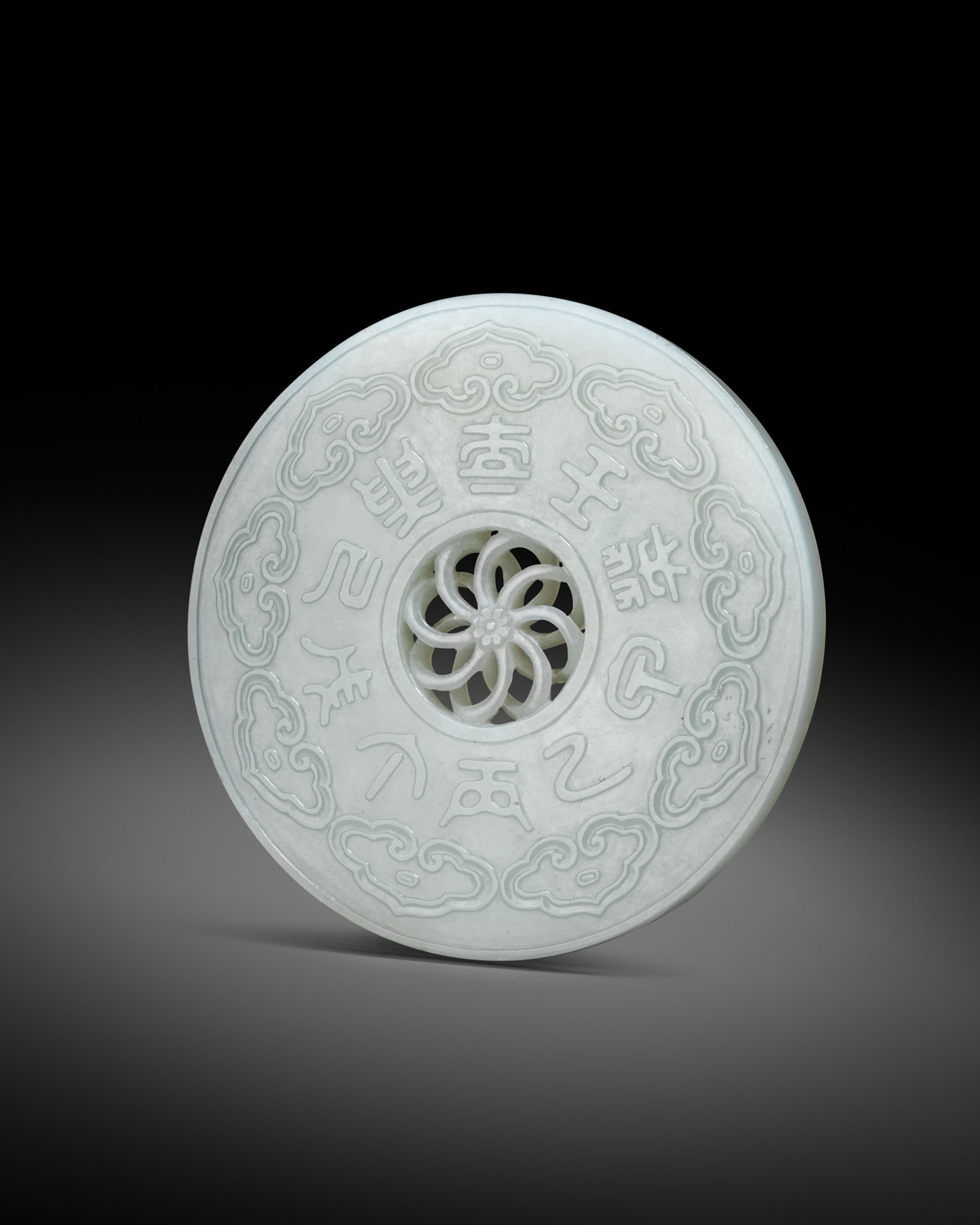 The circular disc delicately pierced to the centre with intertwined petals forming an elegant flowerhead, carved to one side in low relief with The Eight Trigrams, Bagua, with the names of The Ten Heavenly Stems, Tiangan, in seal script beneath a continuous band of ruyi-heads to the reverse, the stone of an even white tone, 9.2cm.