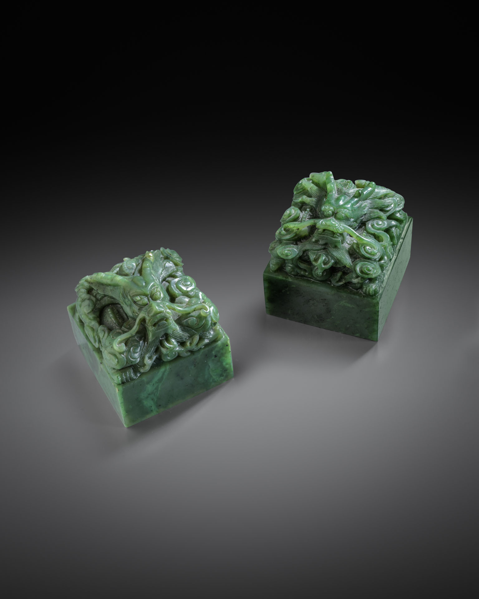 A PAIR OF FINE CHINESE IMPERIAL SPINACH-GREEN JADE 'DRAGON' SEALS