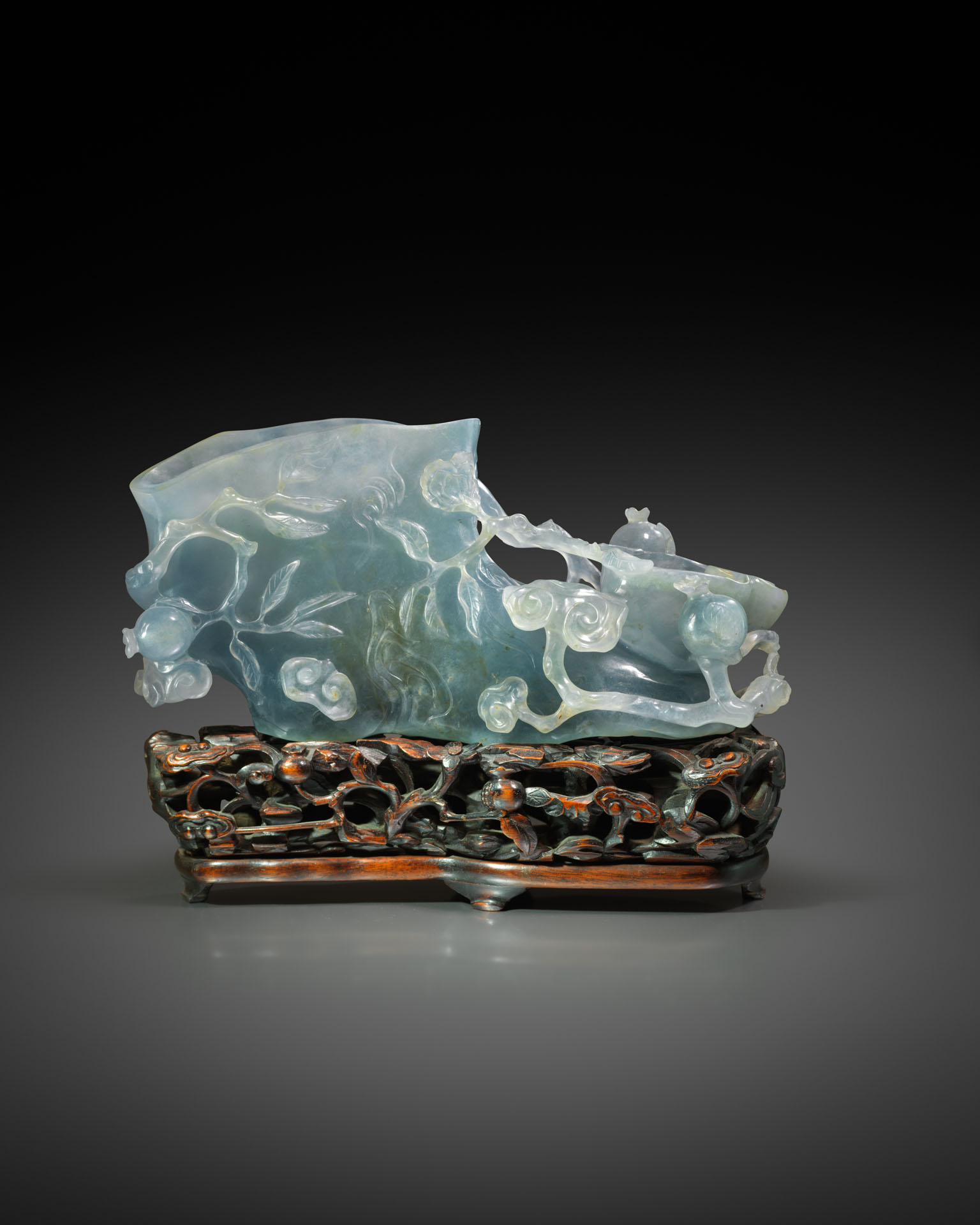 Chalcedony is a cryptocrystalline quartz, and has a variety of colour tones that are mainly determined by the presence of trace elements such as chromium and iron. It is treated as a 'jade-like' gemstone and is commonly used by Chinese craftsmen for carving because of its hardness and waxy lustre. Both pomegranate and peach are fruits that symbolically represent abundance and numerous offspring. But, while peach is an indigenous fruit of China, the pomegranate is a foreign plant introduced from Central Asia, along the Silk Road to China. The lingzhi fungus has a strong symbolism in Chinese culture, representing longevity and immortality. The combination of all these auspicious symbols suggests that the vase was probably made for a special occasion such as a birthday.