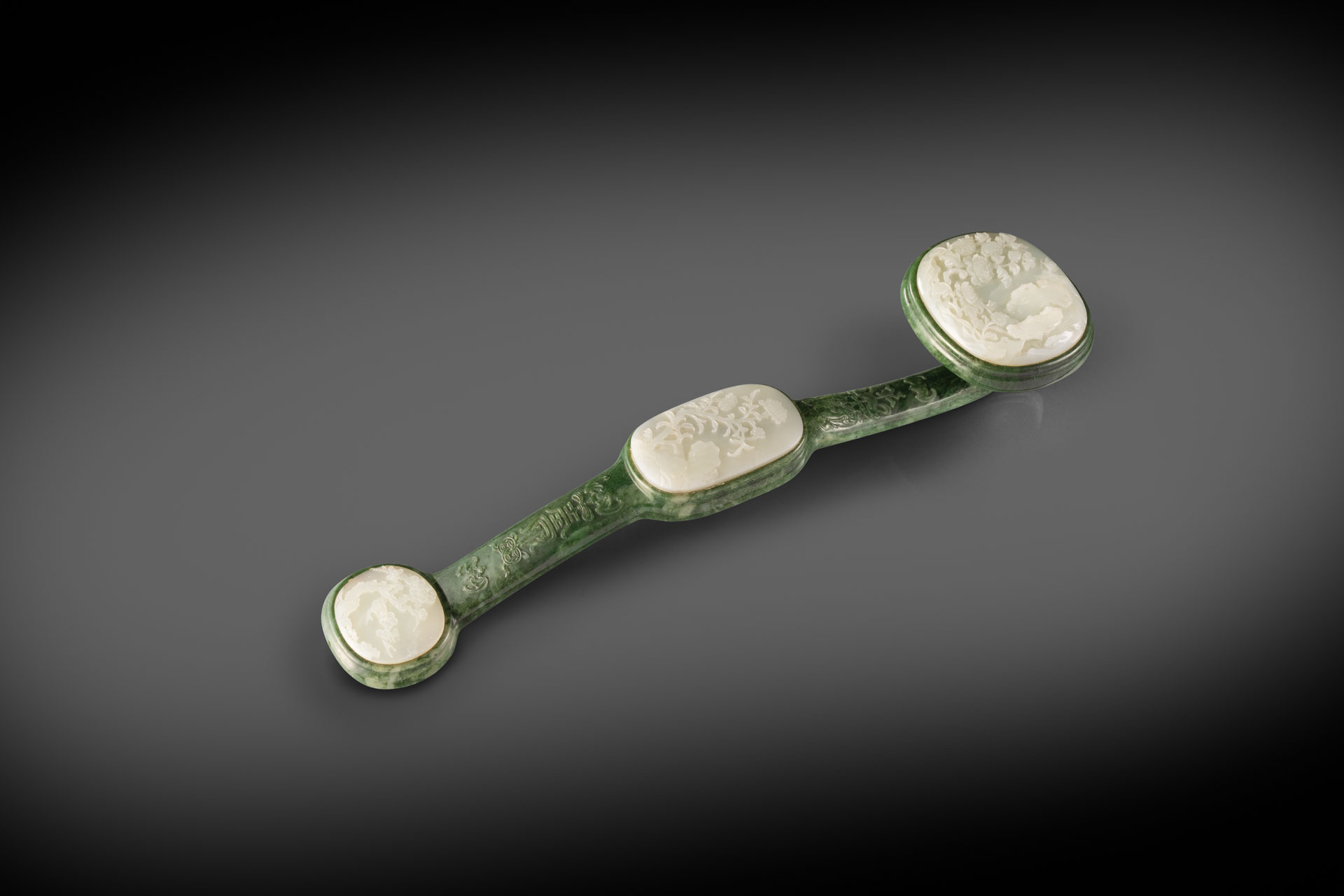 The mottled dark green sceptre inset with three oval white jade plaques to the head, stem and terminal, the largest worked in relief with two butterflies fluttering above blossoming peony and aster in a mountainous landscape, the central panel carved with a flowering chrysanthemum branch growing amidst rockwork, the smallest plaque depicting a gnarled prunus tree, with twin-fish and a small bat surrounding a fylfot and qing to the upper section of the curved stem, the lower section of the shaft decorated with a pair of bats encircling a shou character and beribboned cash, the undecorated underside with a ribbed edge, 42.5cm.