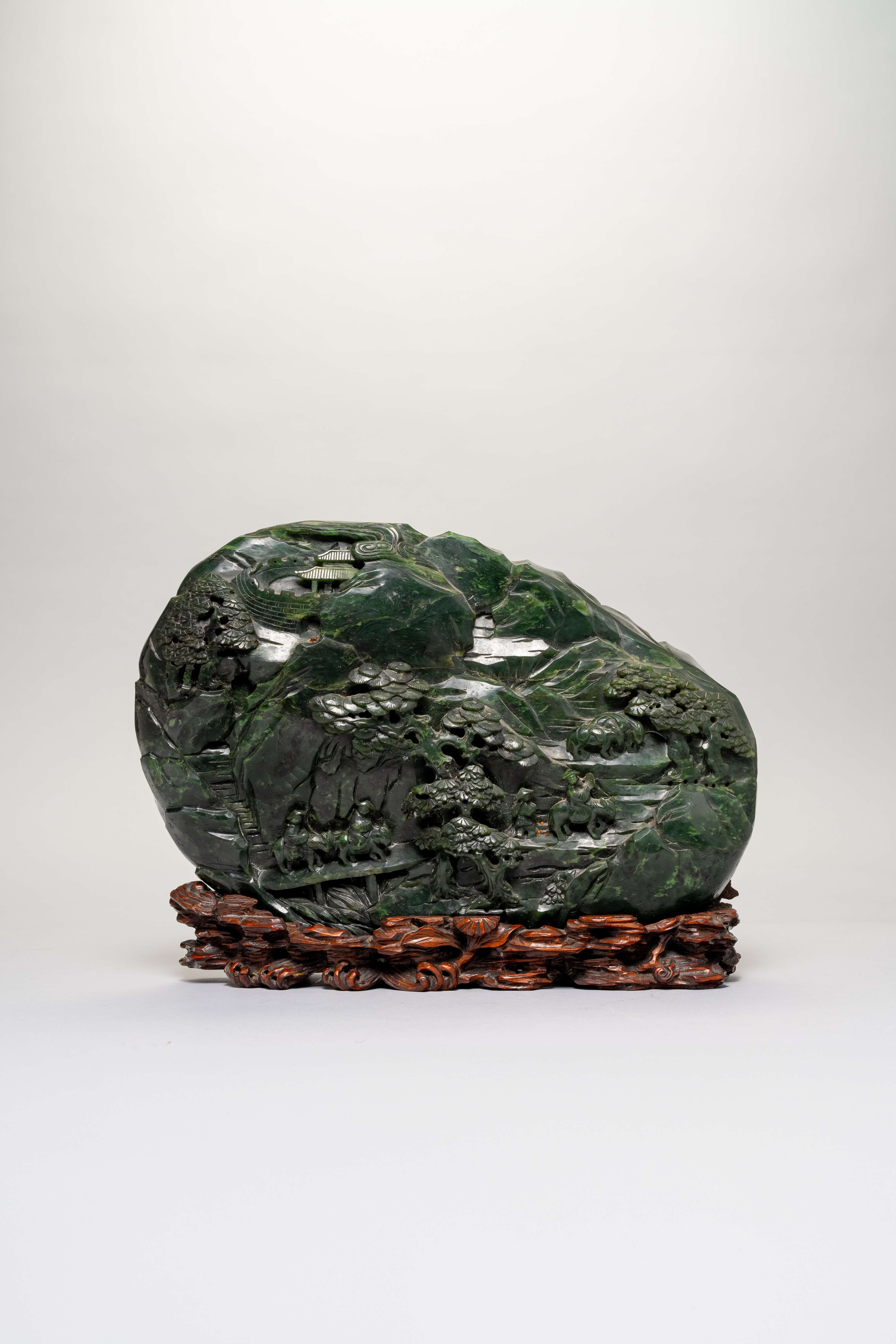 Cf. A related spinach-green jade mountain carving from the collection of Miss H E Ionides was exhibited at The Royal Academy of Arts as part of the International Exhibition of Chinese Art, 1935-36, catalogue no.2785.