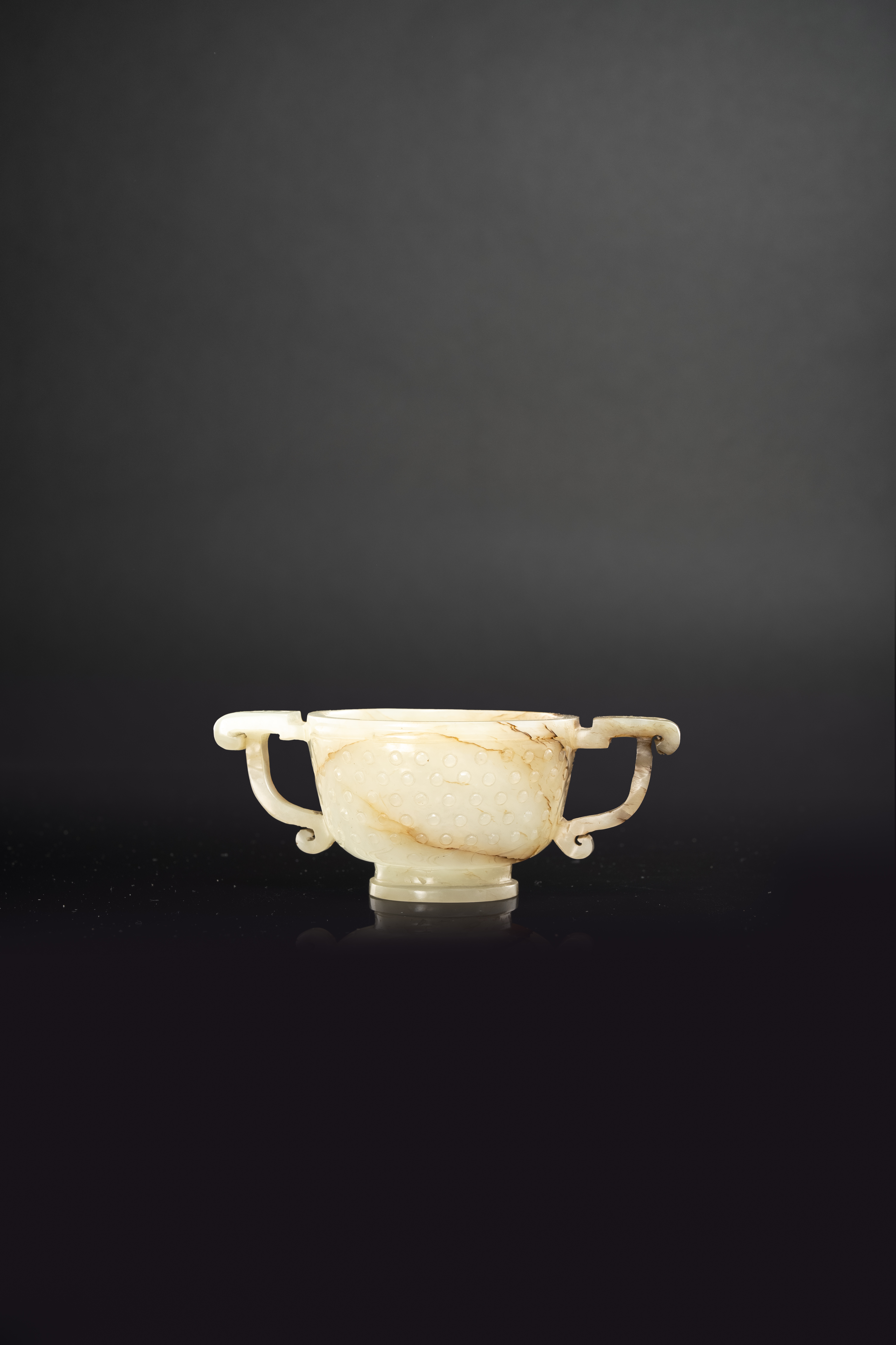 The U-shaped body carved with five bands of raised bosses, the sides set with handles decorated with ruyi motifs, all raised on a short circular foot, the stone with attractive swirling striations, 11.5cm.