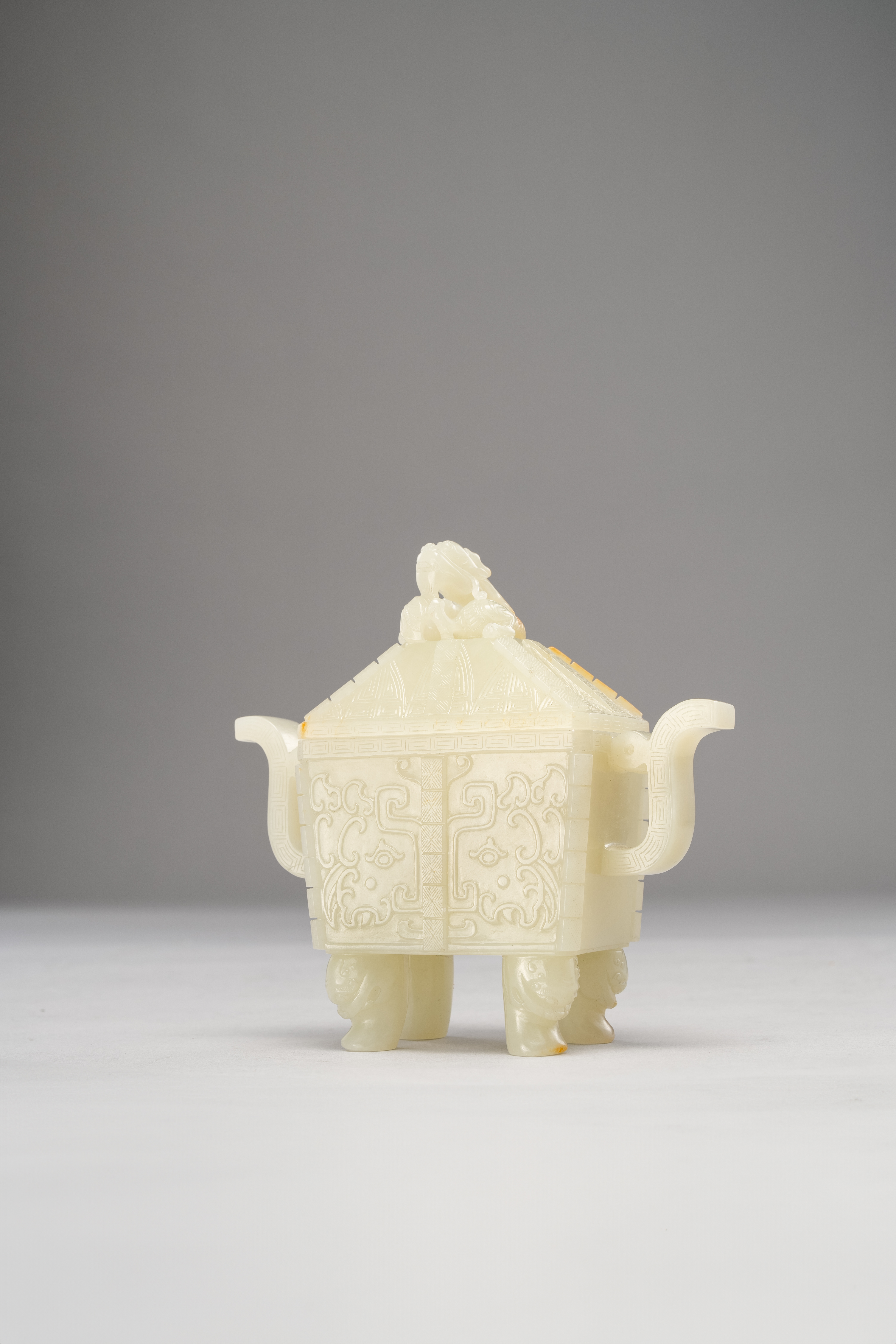 The rectangular body set with two handles, with a pyramid-shaped cover surmounted by a dragon, raised on four animal mask feet, 12cm. (2)