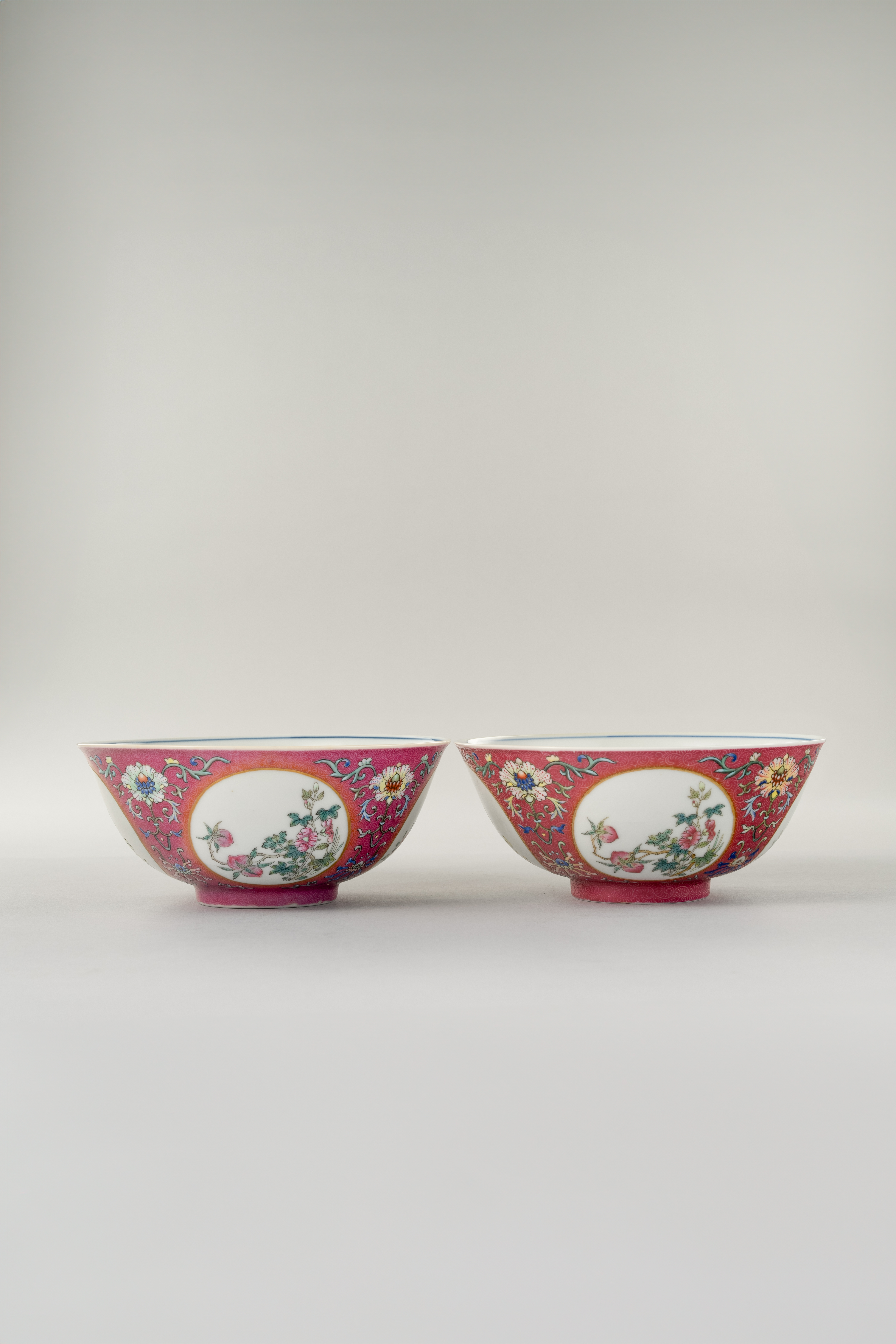 Each decorated to the exterior with four gilt-bordered roundels enclosing flowering sprays including peonies, peaches, hollyhocks and pomegranates, divided by stylised lotus scrolls reserved on a ruby sgraffiato ground, the interior painted with a flower basket encircled by four fruiting flower branches with lingzhi and auspicious emblems in underglaze blue, 14.8cm. (2)