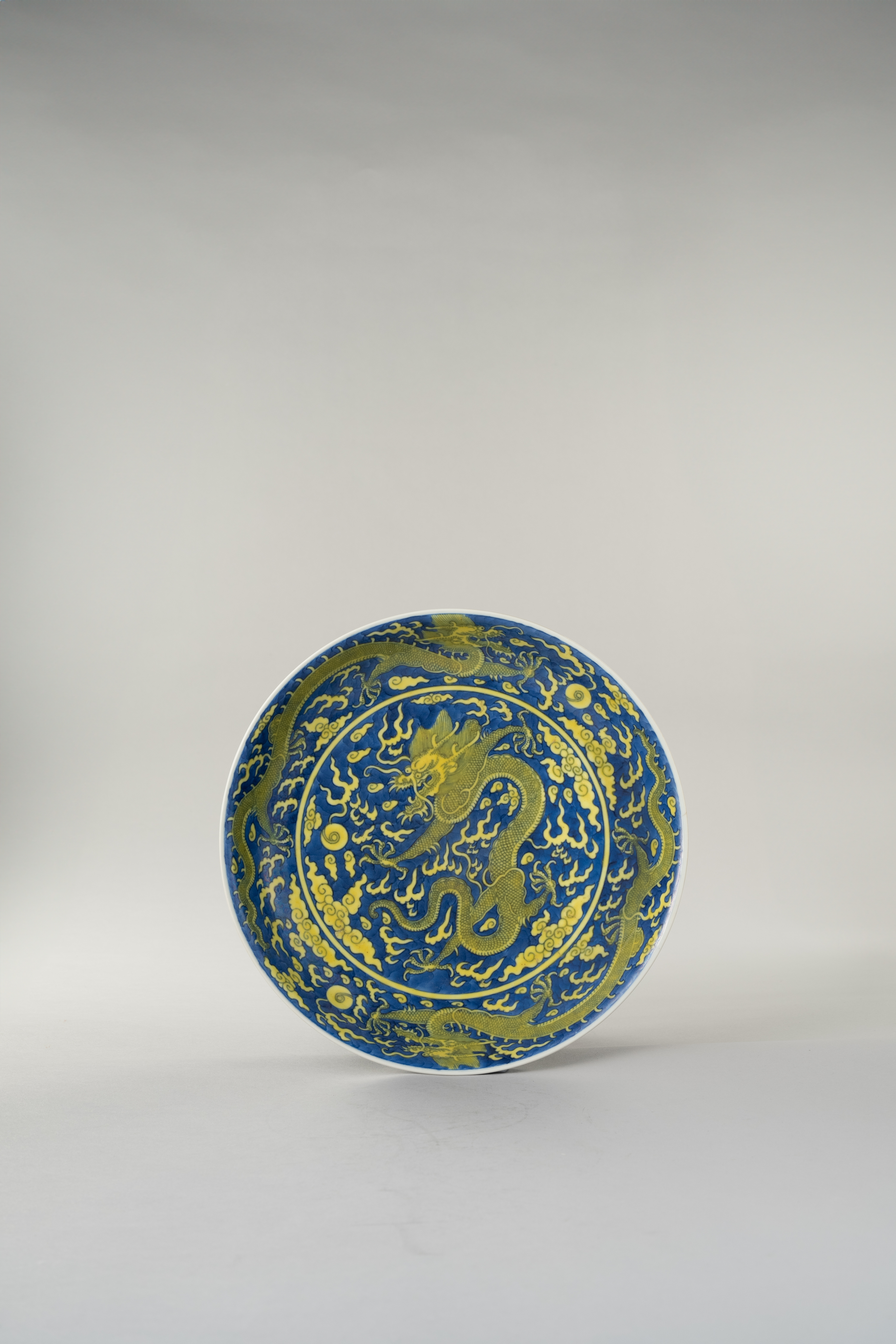 This design and colour combination appears to be based on porcelains from the Kangxi period. Cf. Sotheby’s Hong Kong, 11th April 2008, lot 3017 for another Jiaqing blue ground yellow-enamelled ‘dragon ‘dish.