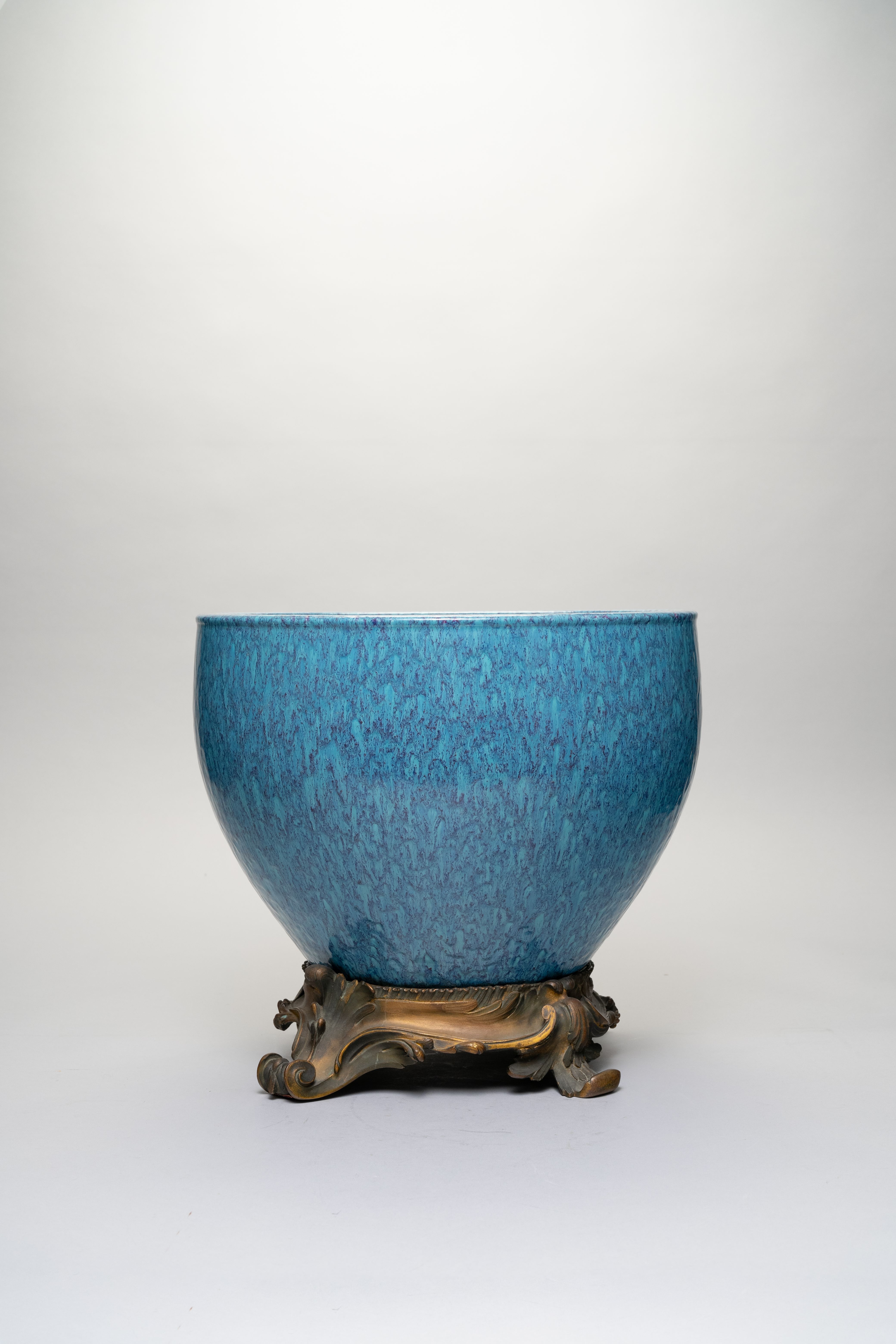 Robustly potted with rounded sides and a protruding slightly everted lip, the body coated inside and out with an even blue and crimson flecked glaze, the base with an incised mark, together with a European ormolu base, 33cm dia. (2)