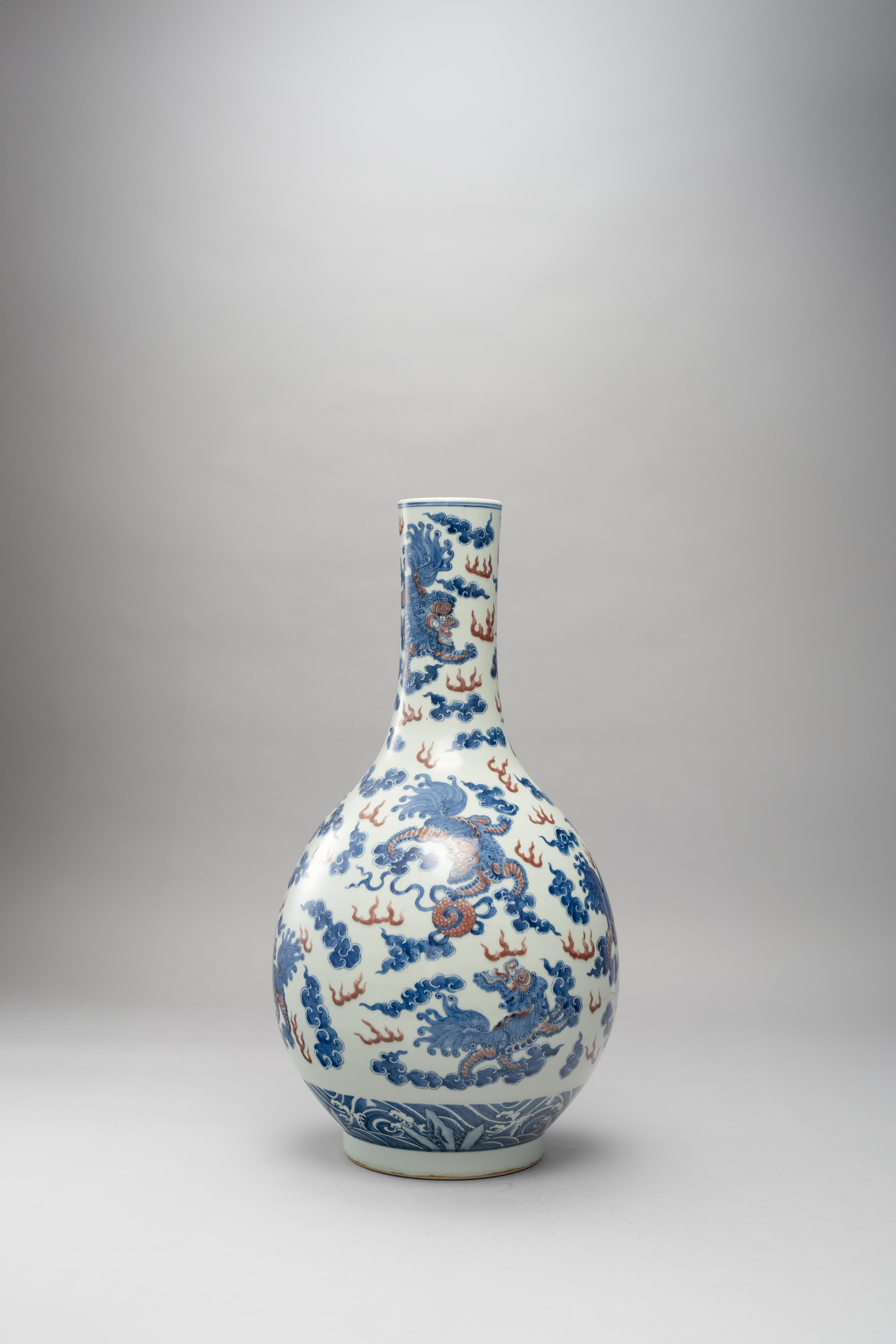 A LARGE CHINESE BLUE AND WHITE AND UNDERGLAZED-RED BOTTLE VASE