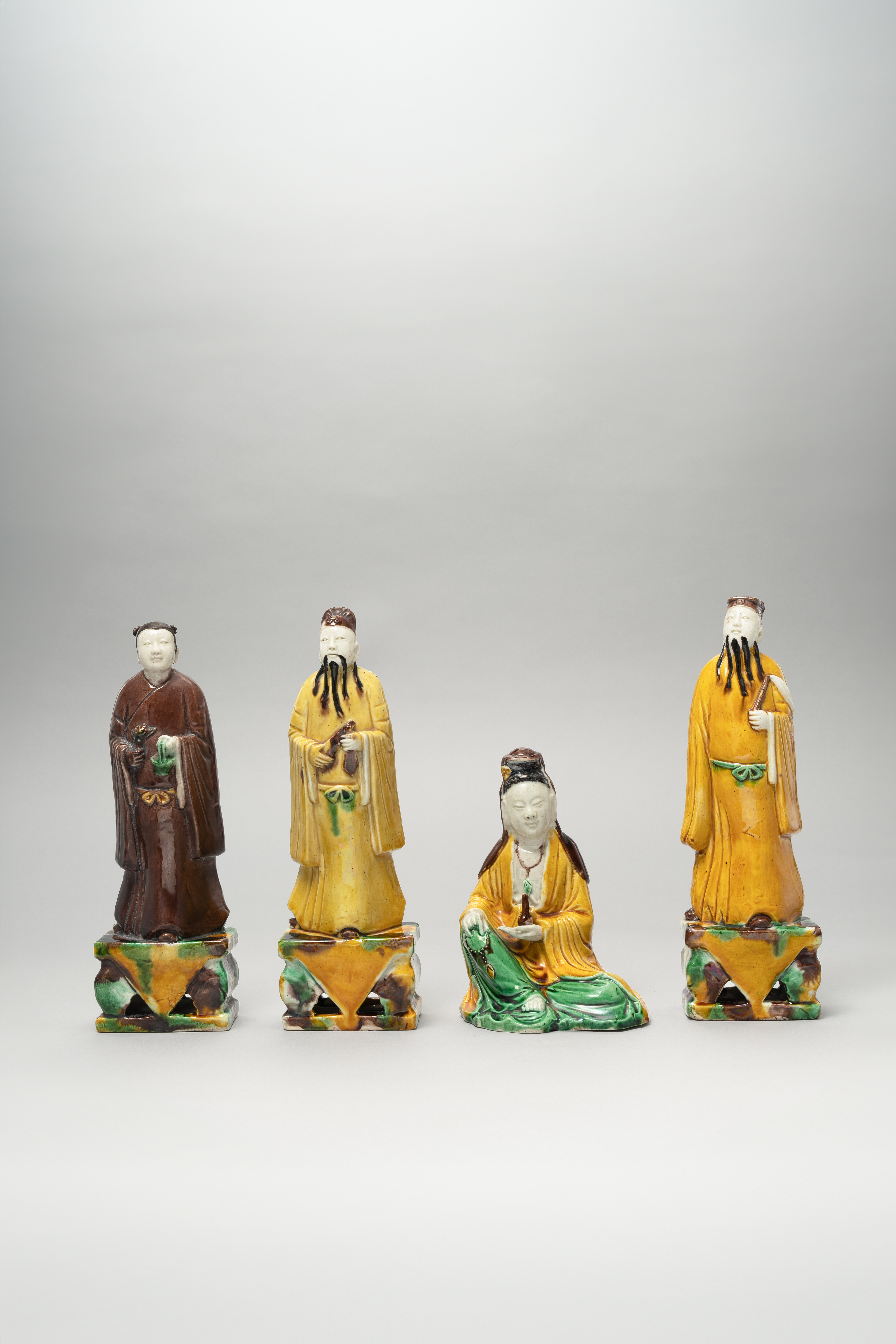 Three standing on rectangular plinths, the fourth a seated figure of Guanyin holding a rosary and a bottle, all decorated with green, brown and mustard yellow enamels, 22cm. (4)
