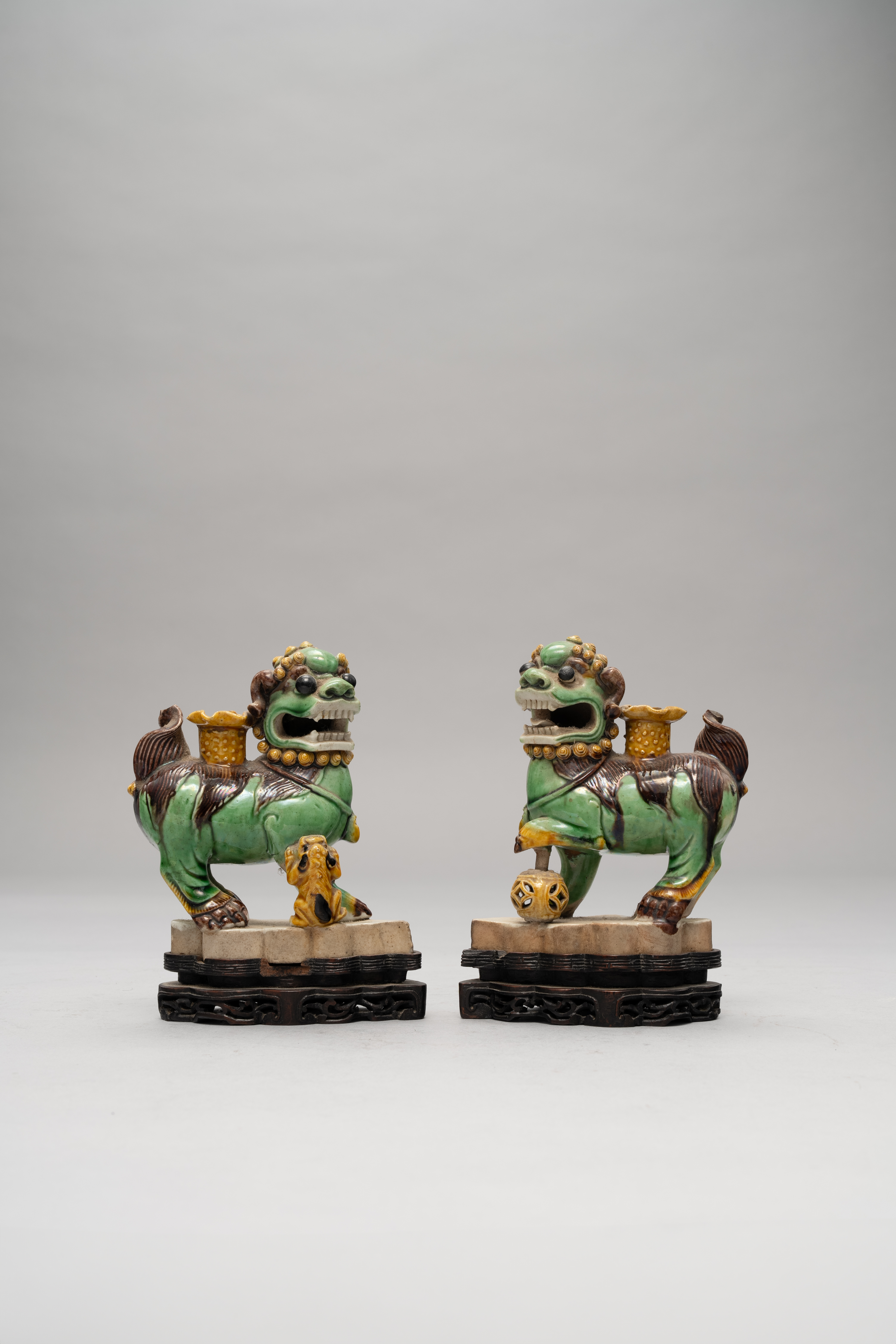 The male with a reticulated brocade ball, the female with her puppy, each with a joss stick holder to their backs, and standing on artemisia leaf bases, paper label for John Sparks, together with fitted wood stands and a paper label inscribed 'Sotheby's Feb 1964, Ionides Collection ...', 13cm. (4)
