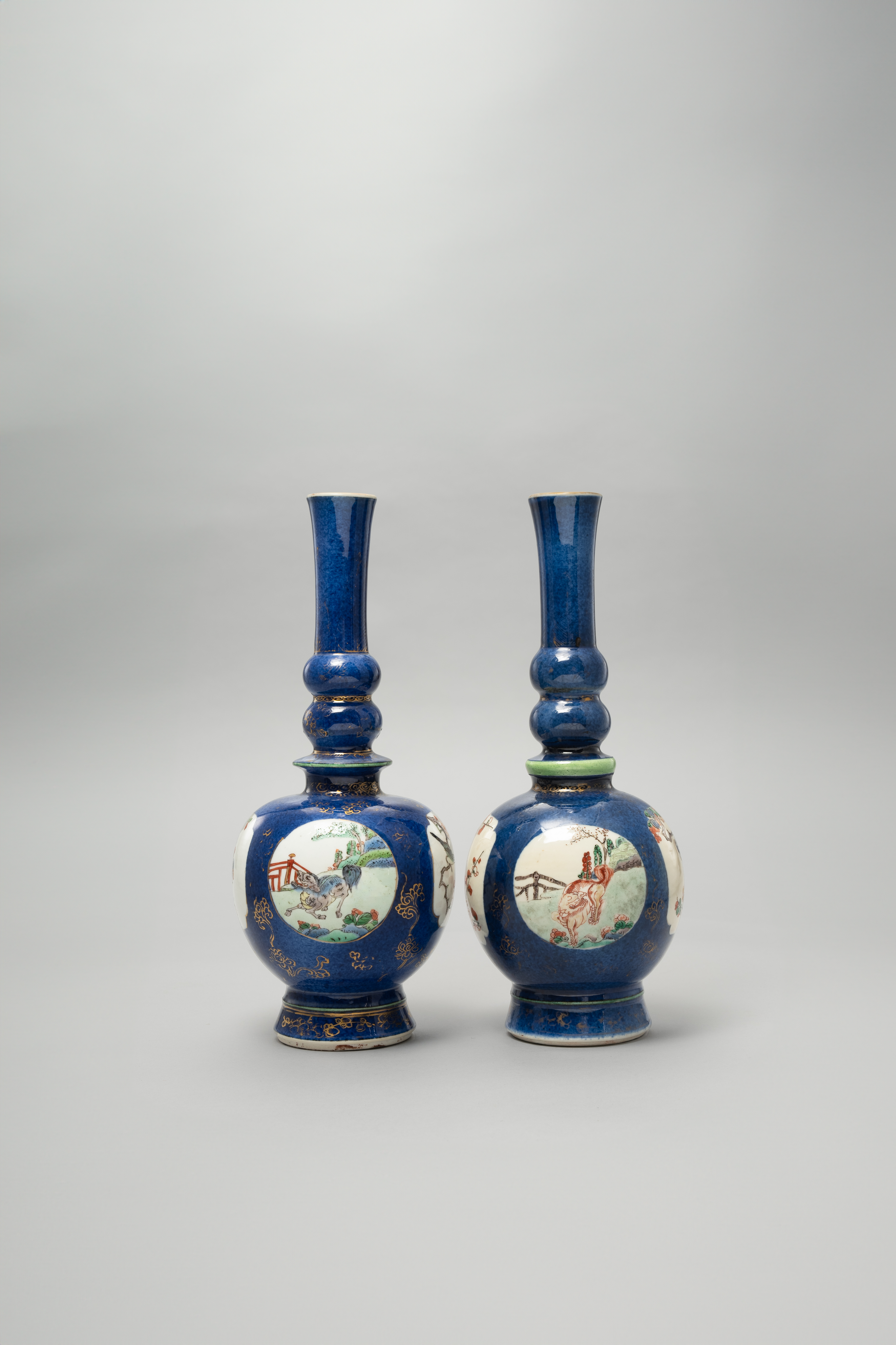 A NEAR PAIR OF CHINESE FAMILLE VERTE POWDER-BLUE GROUND BOTTLE VASES