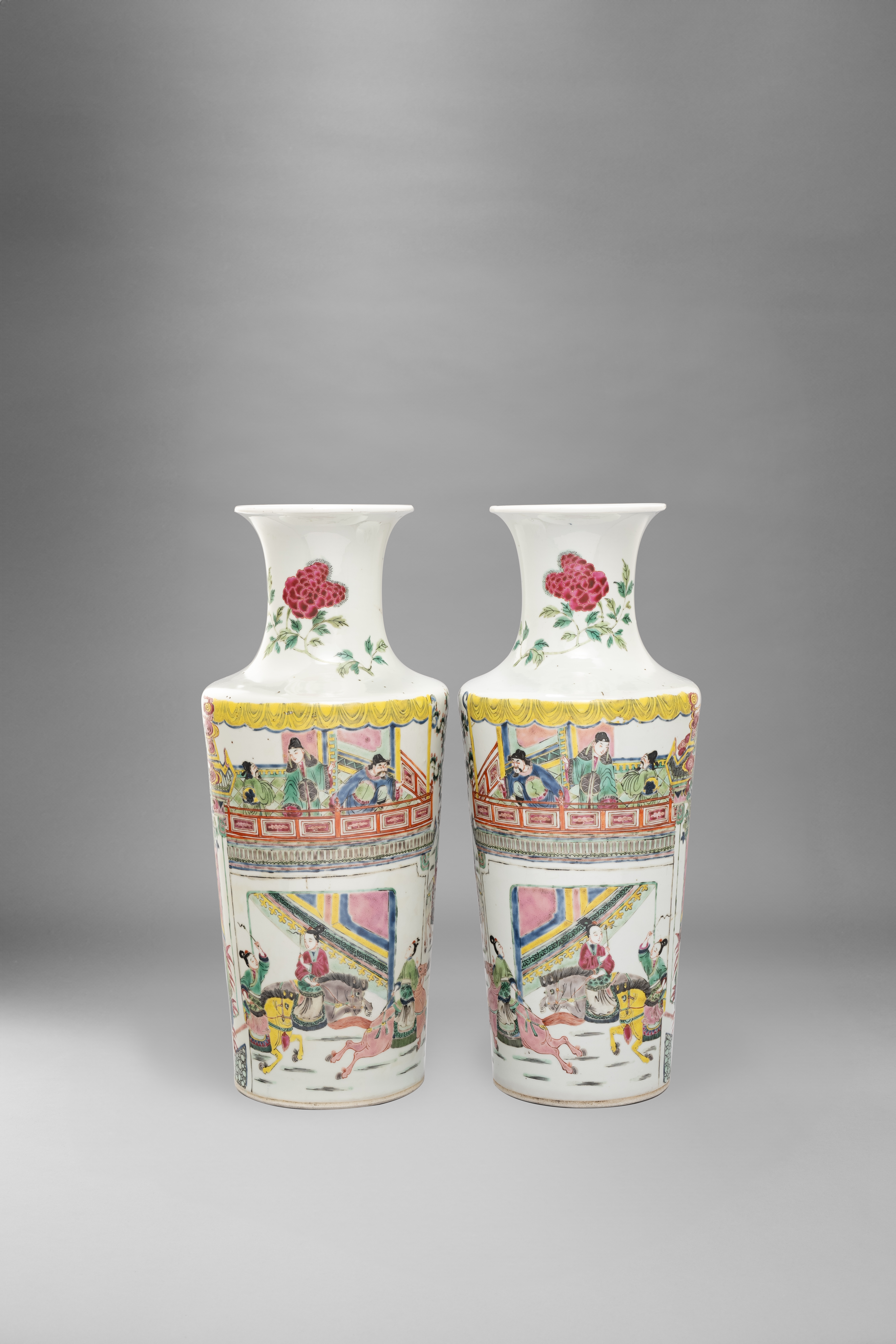 The tapering cylindrical bodies brightly painted with the lady generals from the Yang family practising their equestrian skills beneath a balcony amongst wutong trees and floral trellis, overlooked by a group of gentlemen on a canopied terrace, the necks with large peony sprays and sprigs of lingzhi, 45cm. (2)
