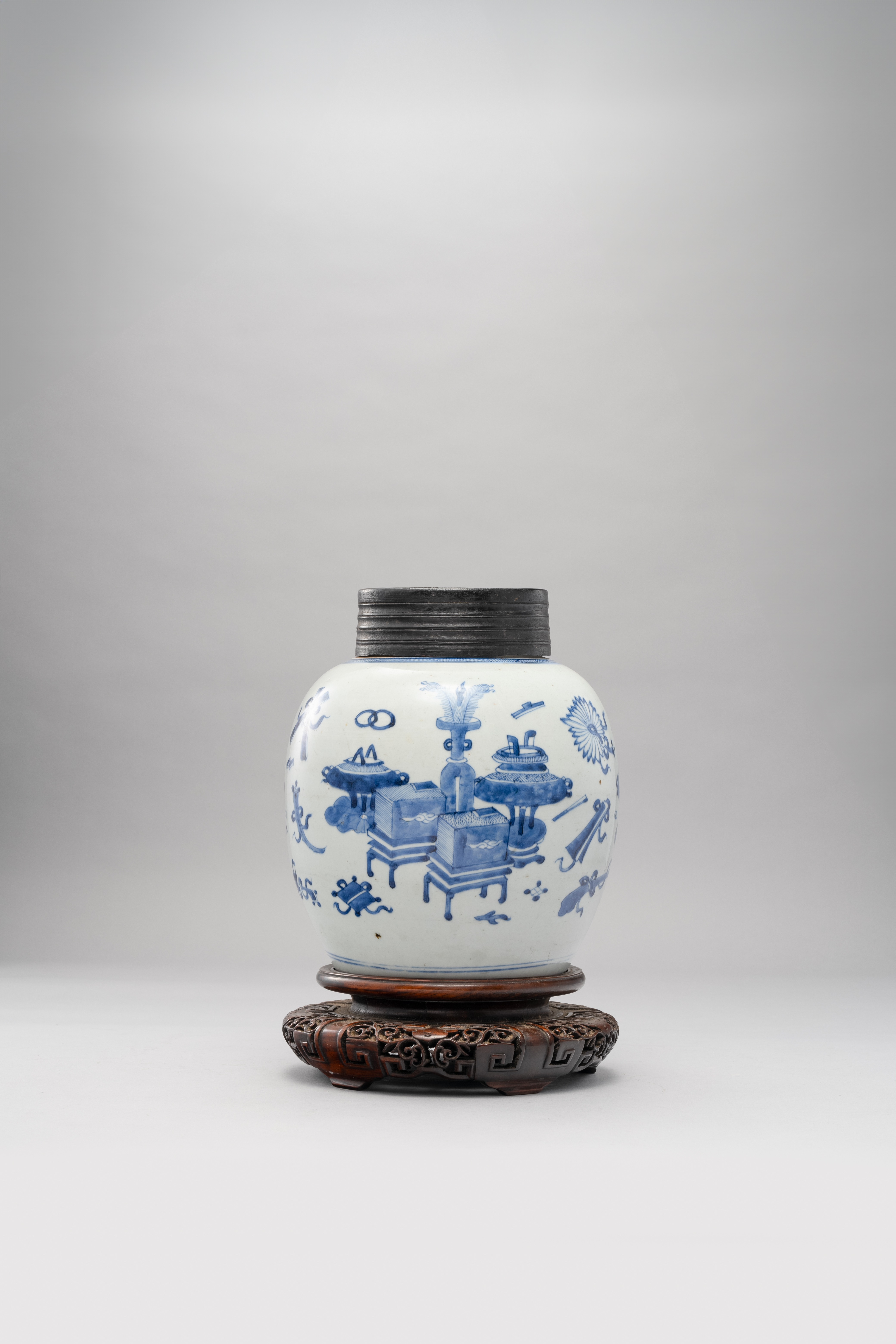 A CHINESE BLUE AND WHITE 'HUNDRED ANTIQUES' JAR