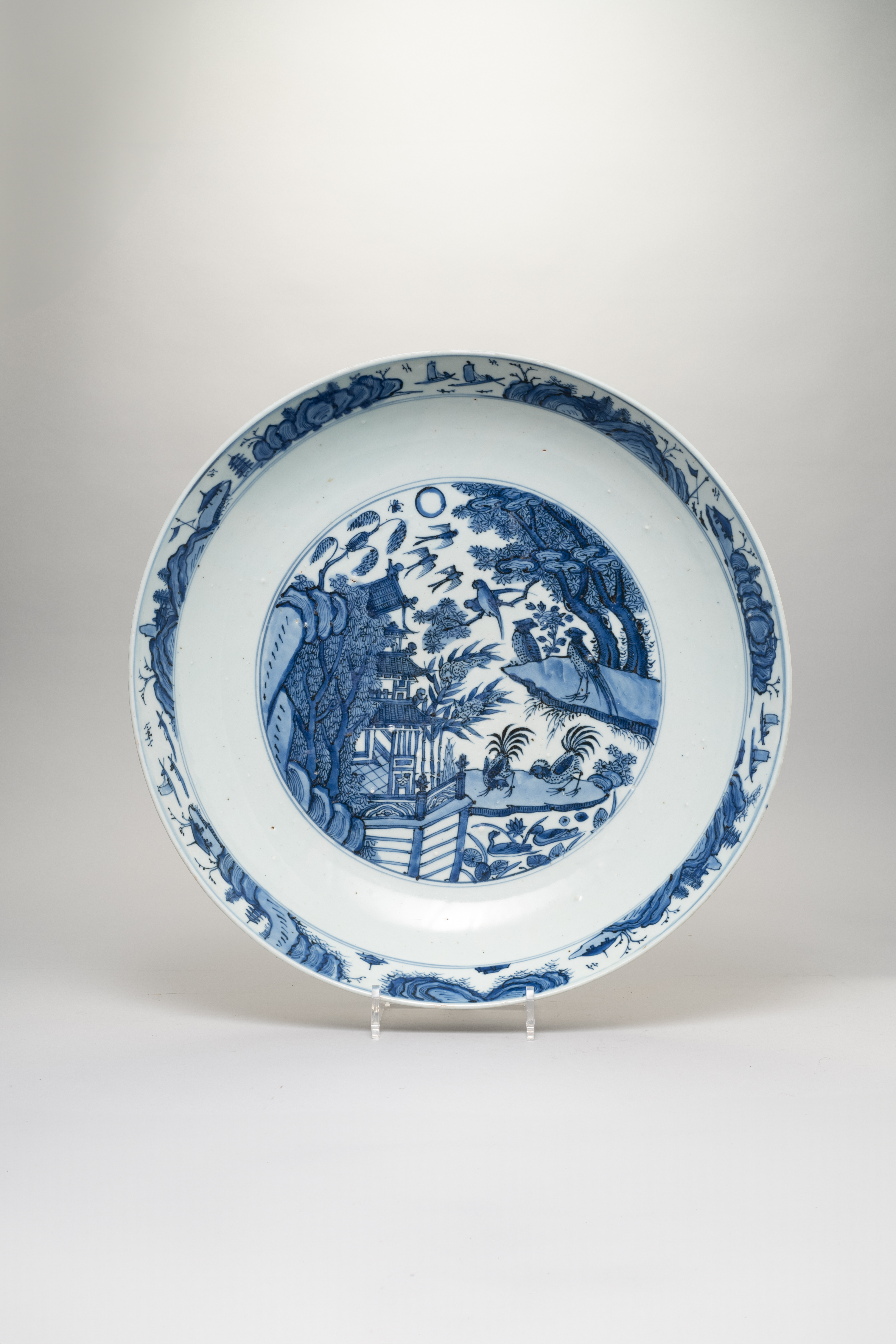 Brightly painted in different shades of cobalt blue with a three-tiered pagoda and an abundance of different birds, including chickens, pheasants, parrots and swallows and with squirrels amidst bamboo and a large cicada, the border painted with small sampans, huts and pagodas on a rocky river landscape, the reverse with four fruiting peach branches, the underside unglazed, 44cm.