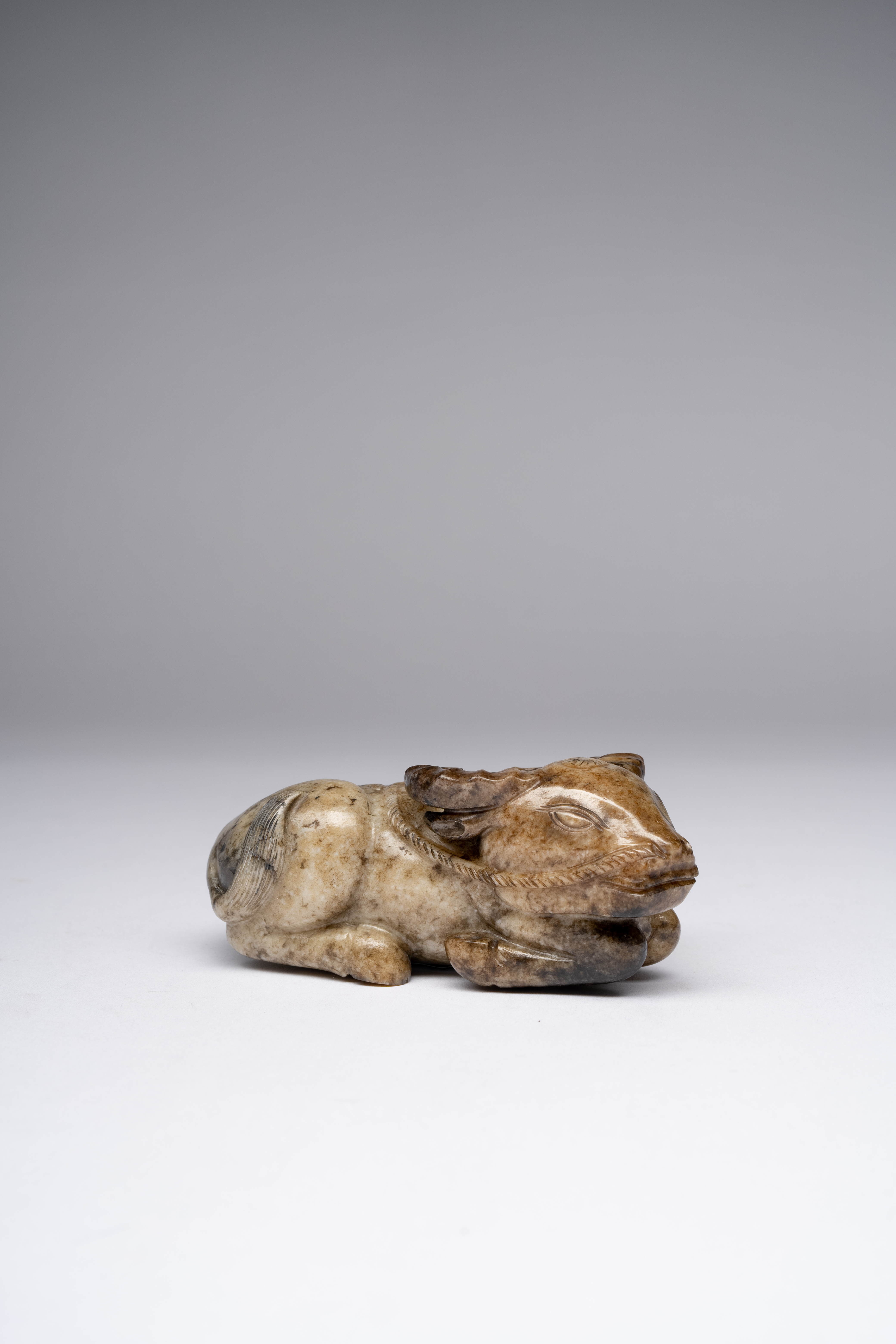 The recumbent beast with a tether running from his nose and looped across his back, the cream coloured stone with many brown and black inclusions, 9cm.