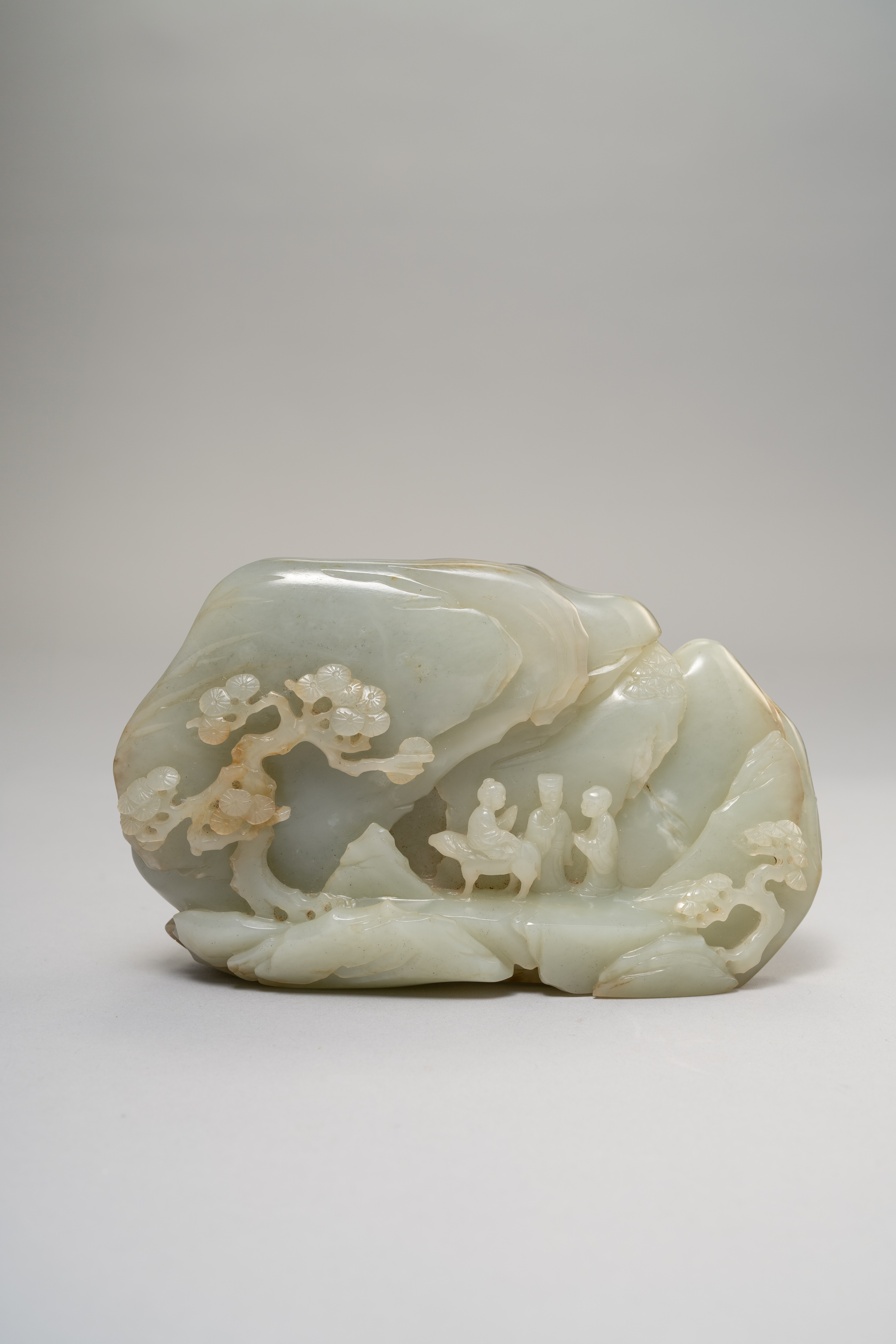 Crisply carved with three figures on a rocky ledge, one mounted on a water buffalo all flanked by pine trees, the reverse with a recumbent ram in the shade of a third pine tree, 14cm.