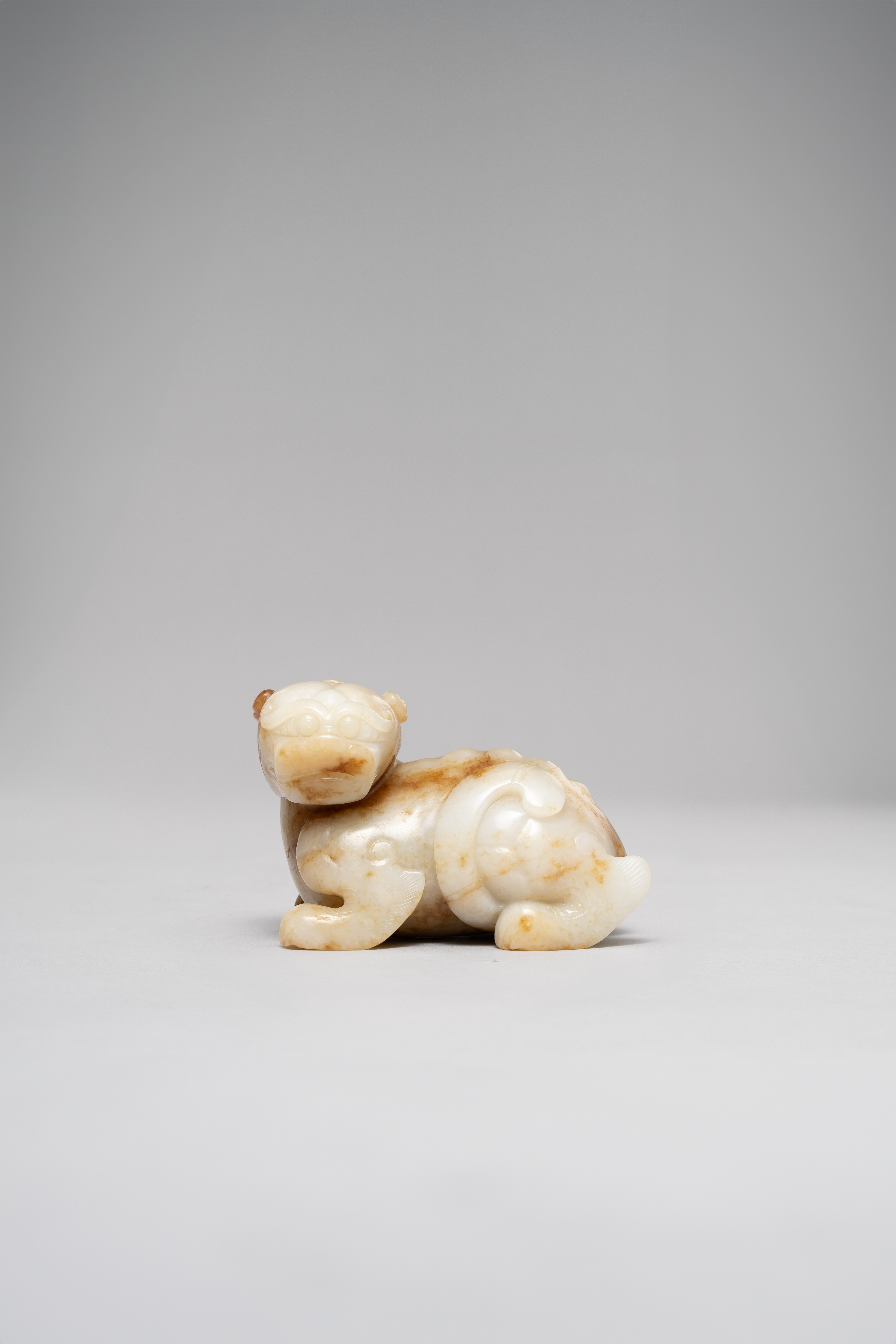 A CHINESE WHITE AND RUSSET JADE CARVING OF A PIXIU