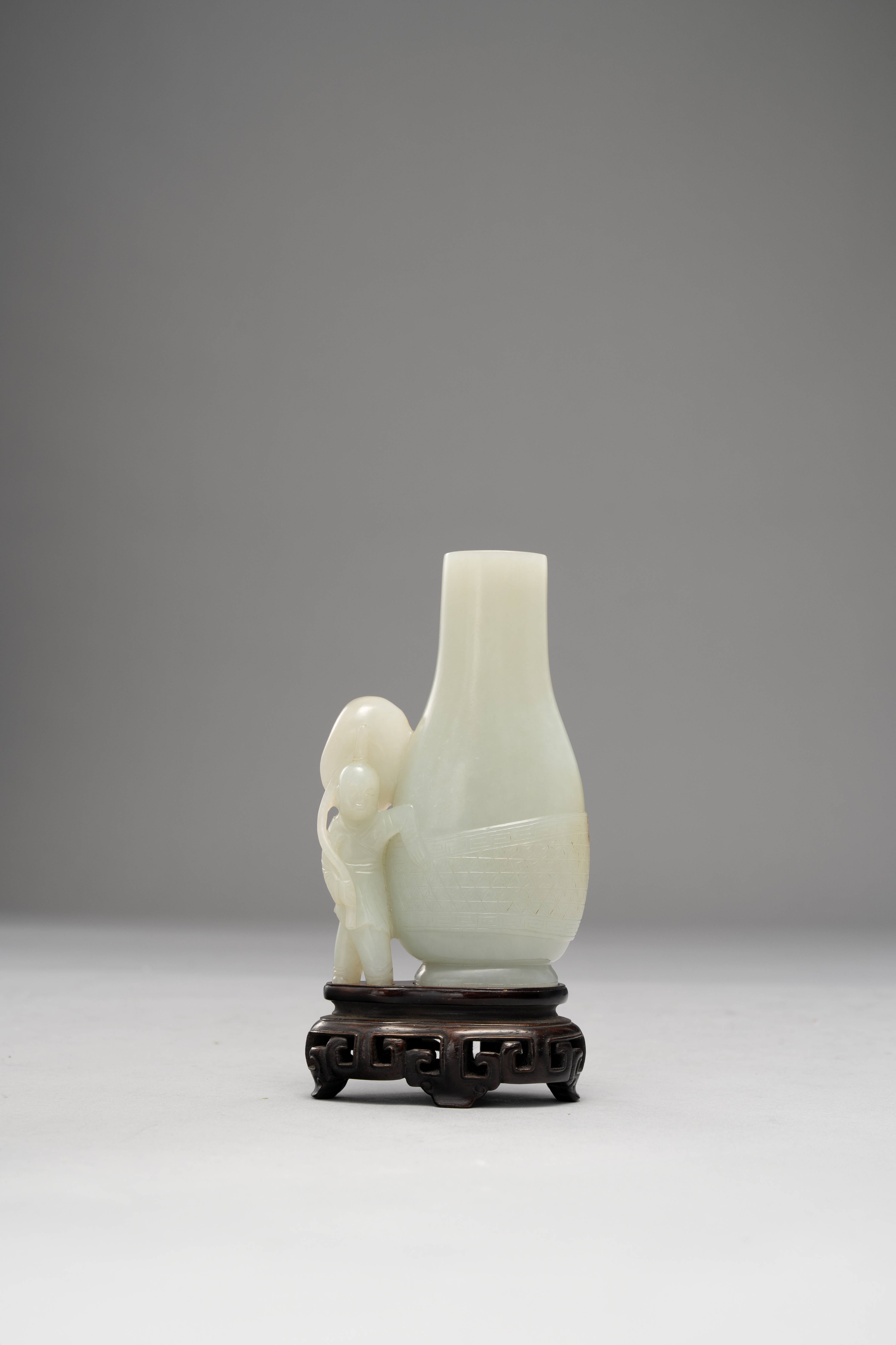 The plain vase with a small figure carrying a large lotus leaf to the side, the lower body wrapped with a wide ribbon, together with a wood stand, 11cm. (2)