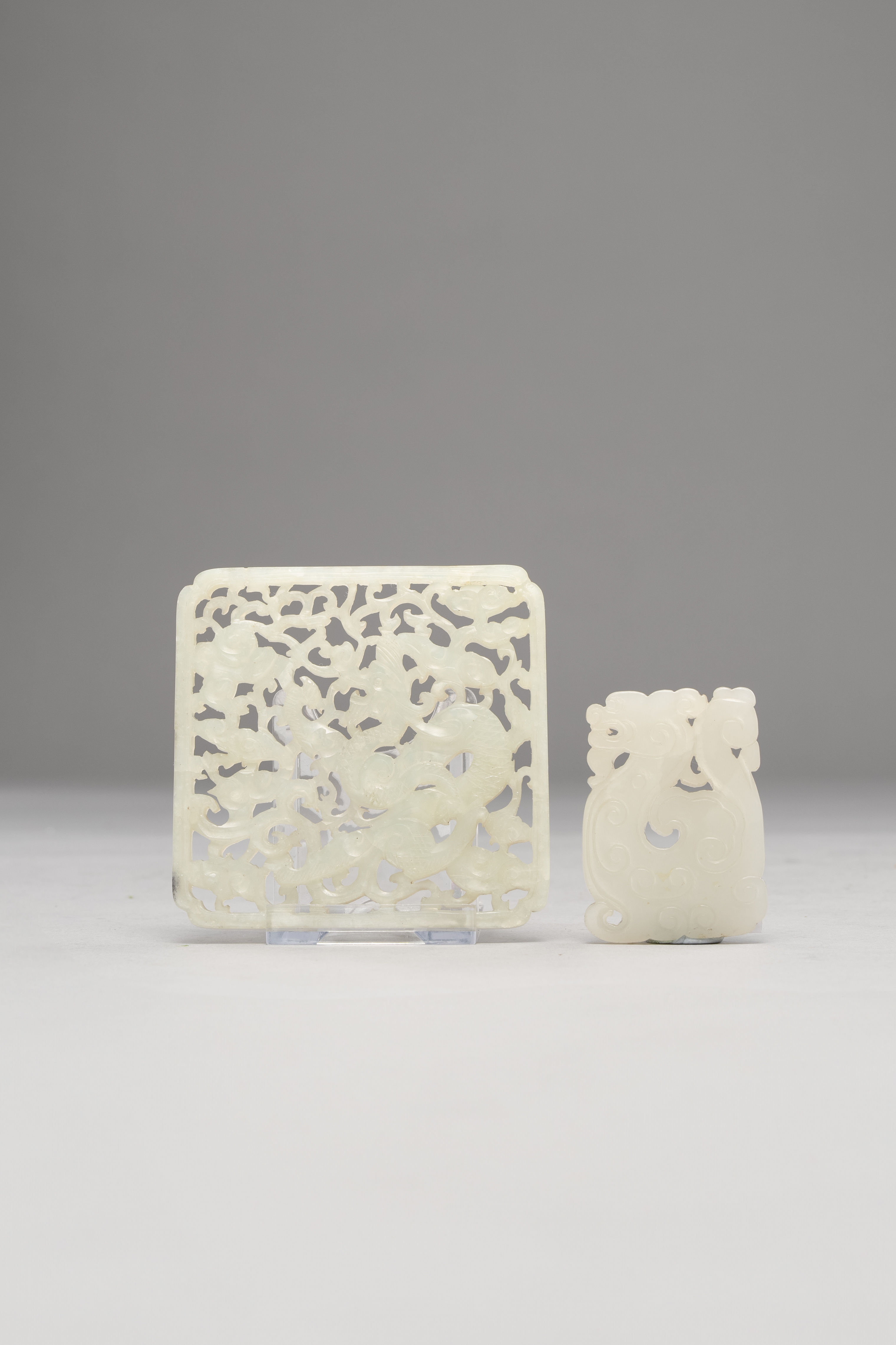 The larger reticulated and carved with a dragon, the other a stylised rectangular plaque carved as a chilong, 7.5cm. (2)