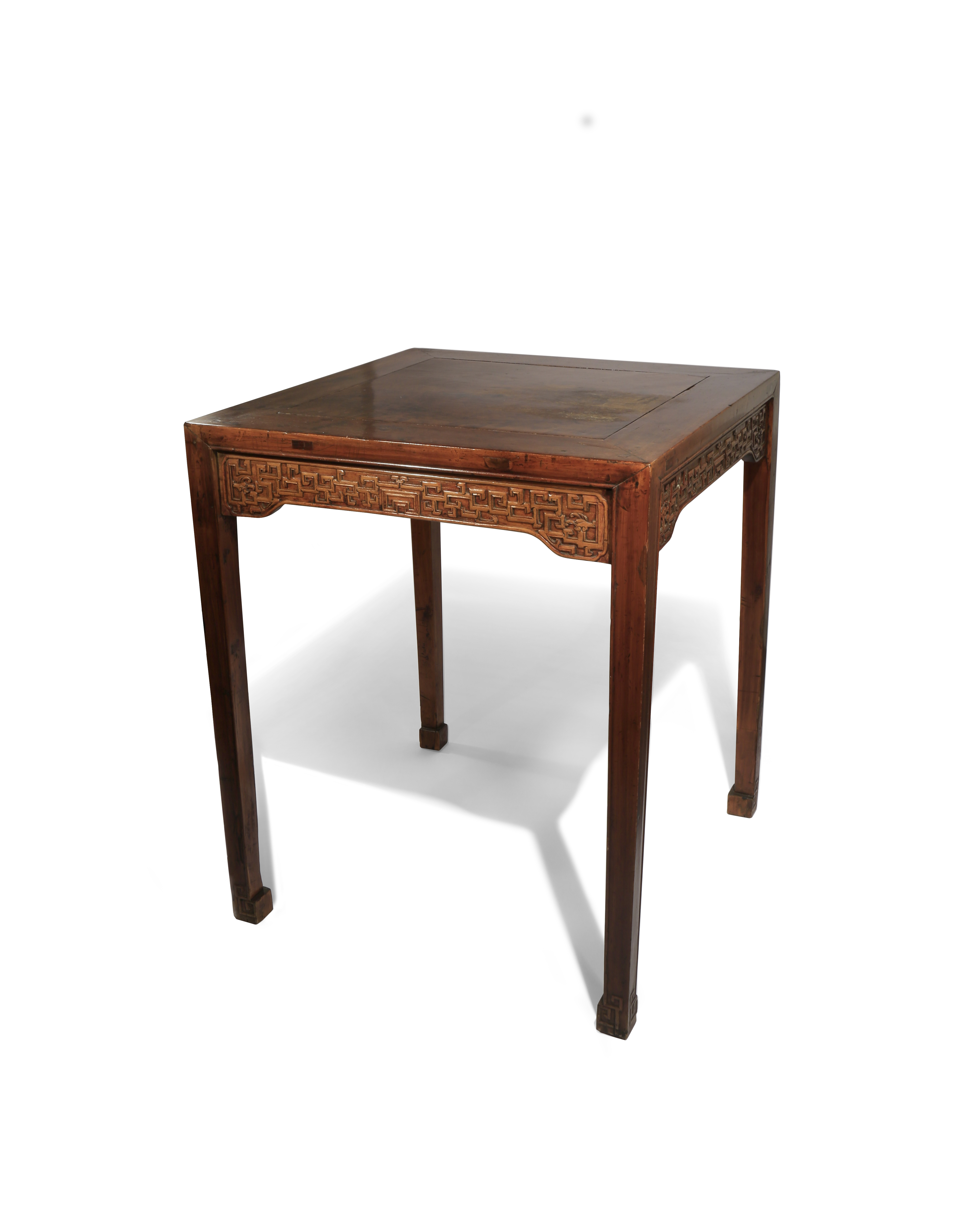 The square panelled top above aprons carved in low relief with stylised mythical beasts, all raised on straight legs terminating in hoof feet, 87cm x 74cm x 74cm.