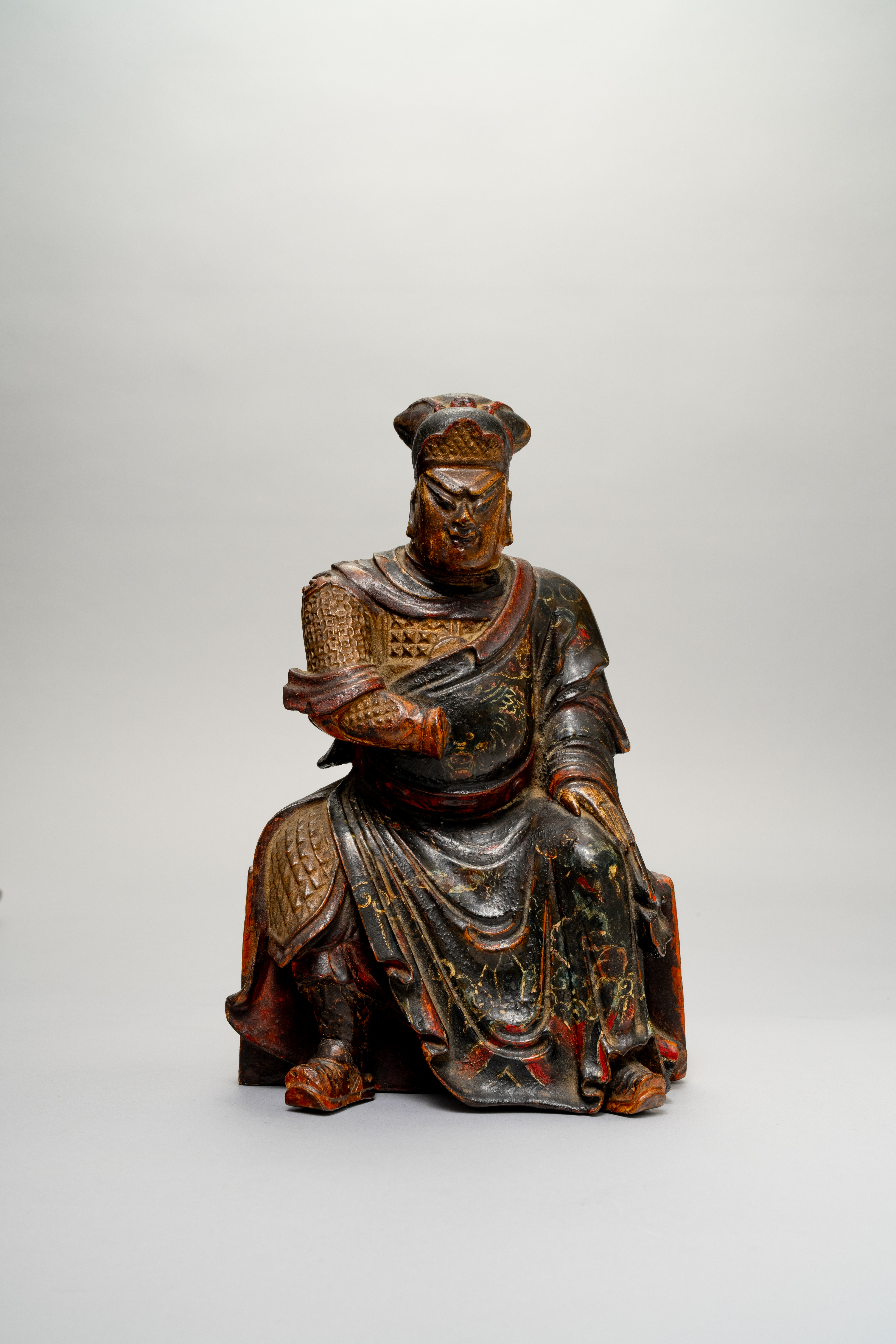 A CHINESE LACQUERED WOOD SEATED FIGURE OF A GUANDI