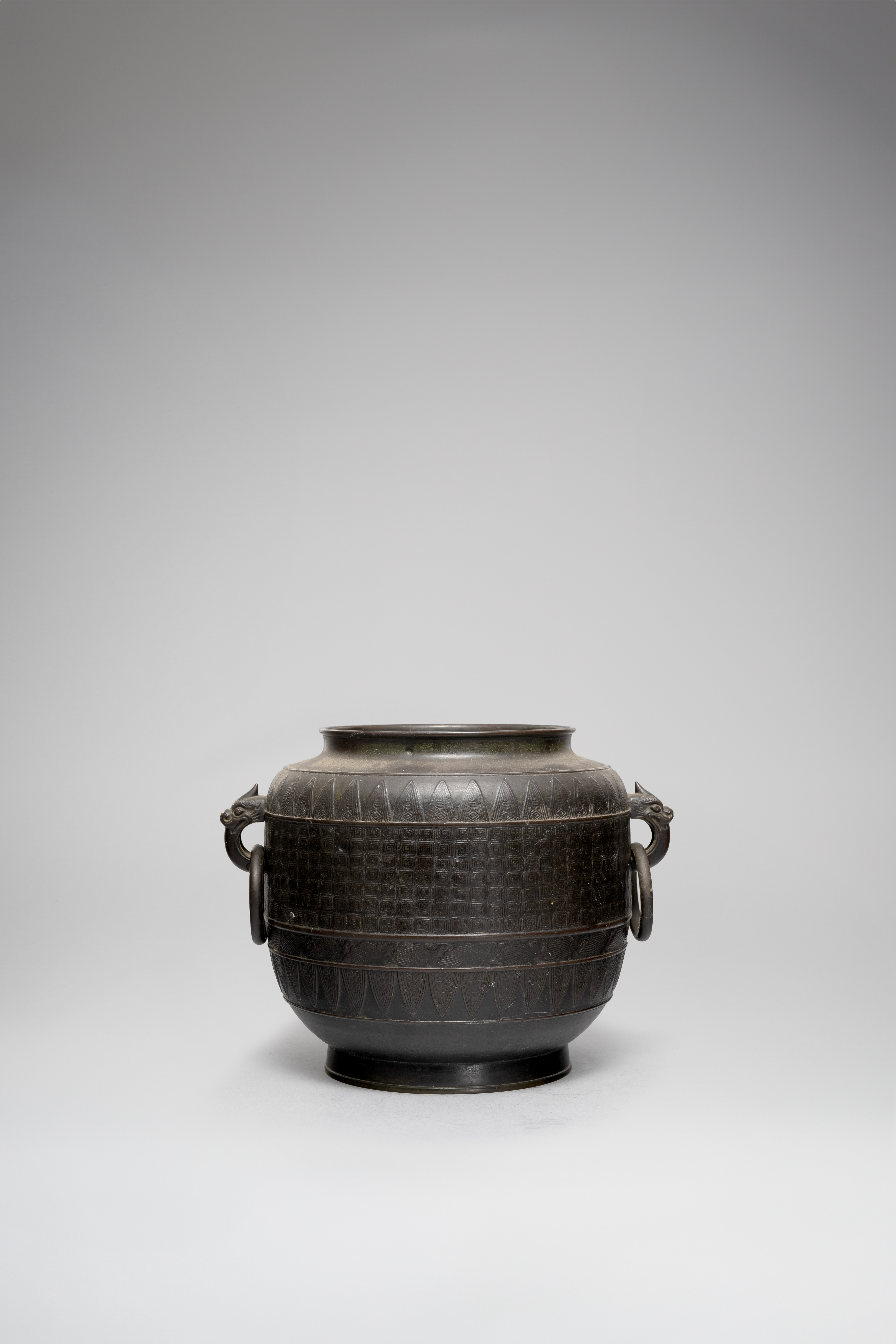 The rounded cylindrical body cast with a wide band of square scrolls, between borders of waves and lappets, the sides with loose ring handles, 4.2kg, 28cm.