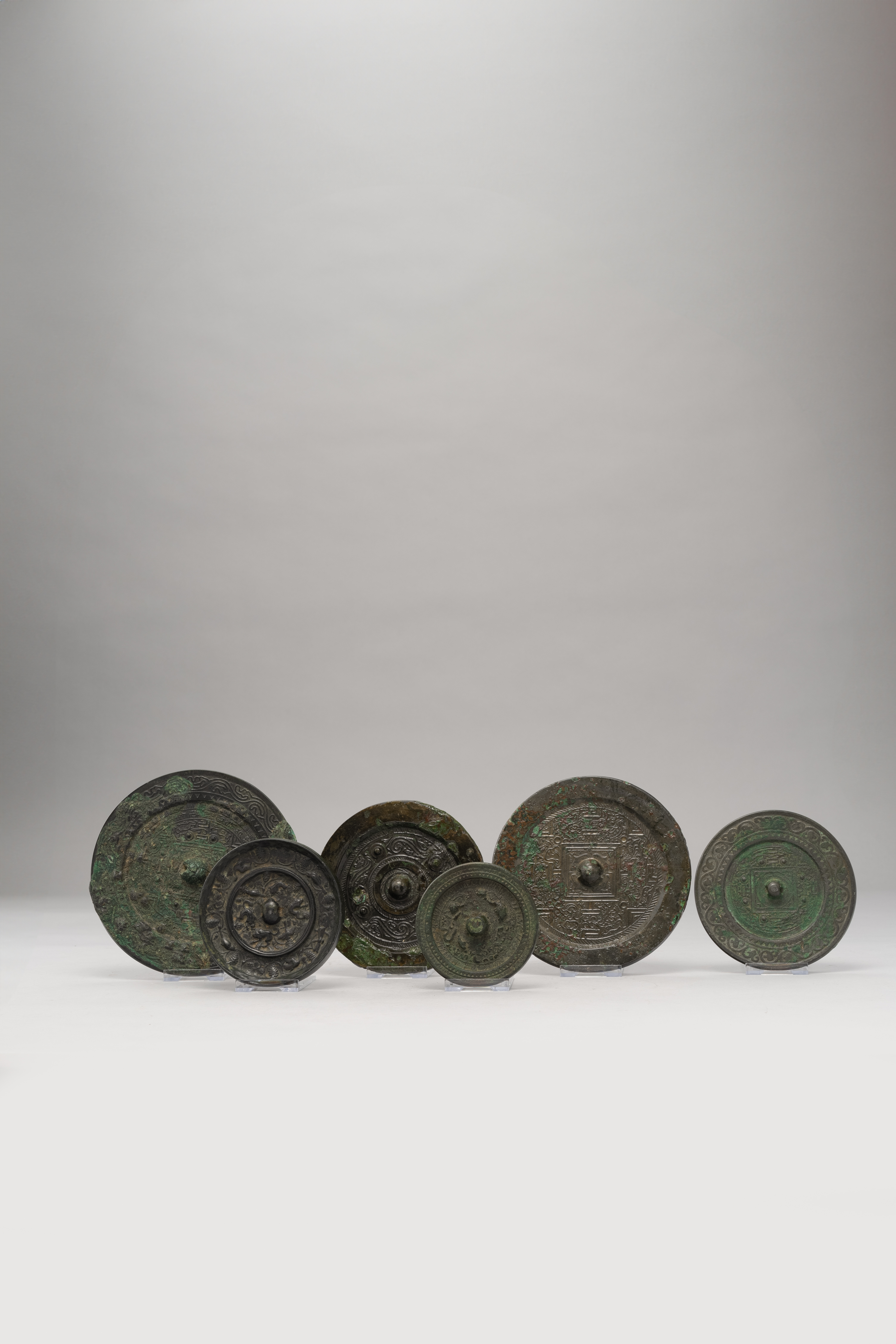 Variously decorated with mythical beasts, foliage scrolls, grape vines and 'TLV' designs, some with malachite markings and encrustations, 1.8kg, 14.5cm. (6)