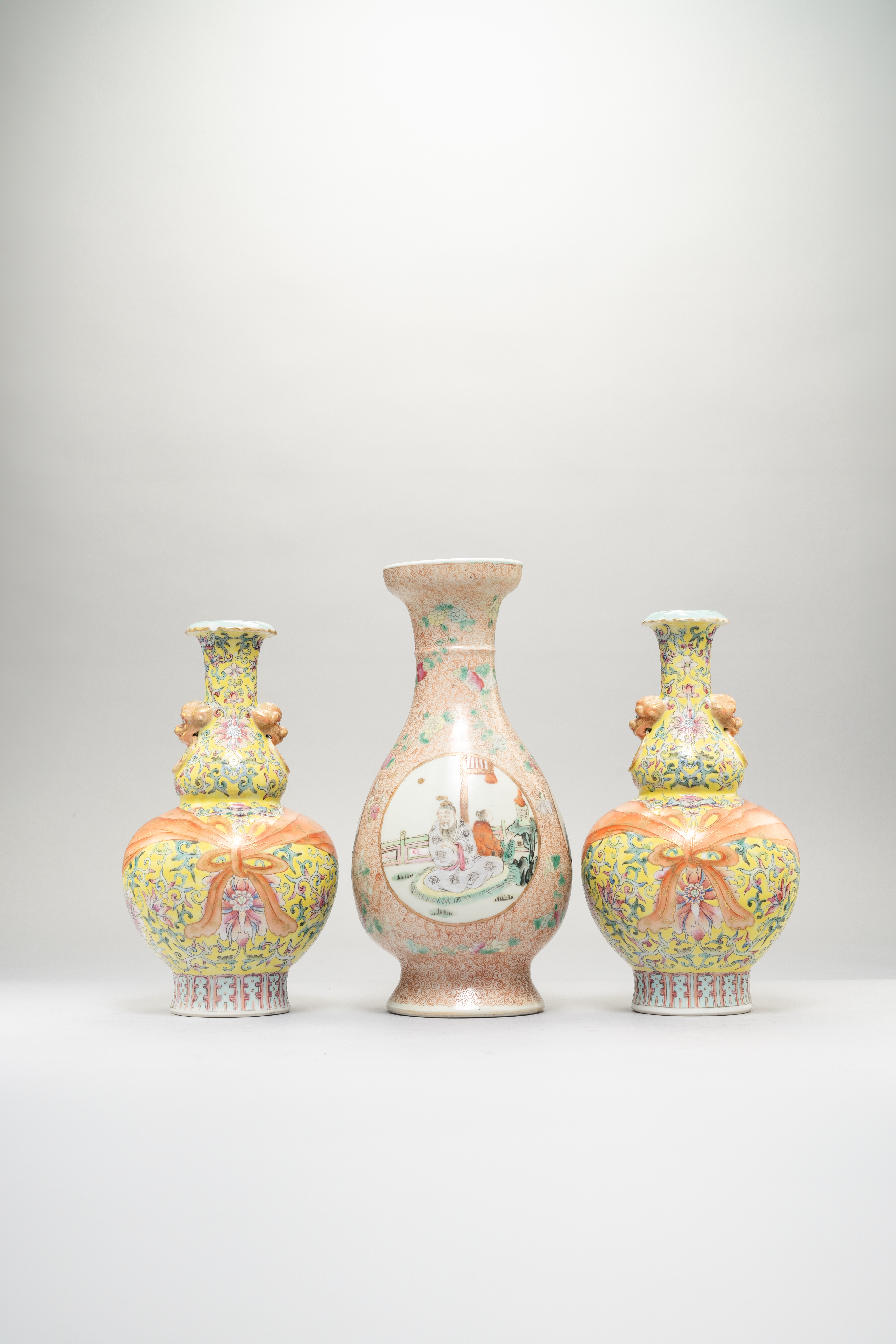 The pair painted with formal lotus scrolls and tied with orange ribbons, the pear-shaped vase with three panels depicting luohans, all with Qianlong marks, 24.5cm. (3)