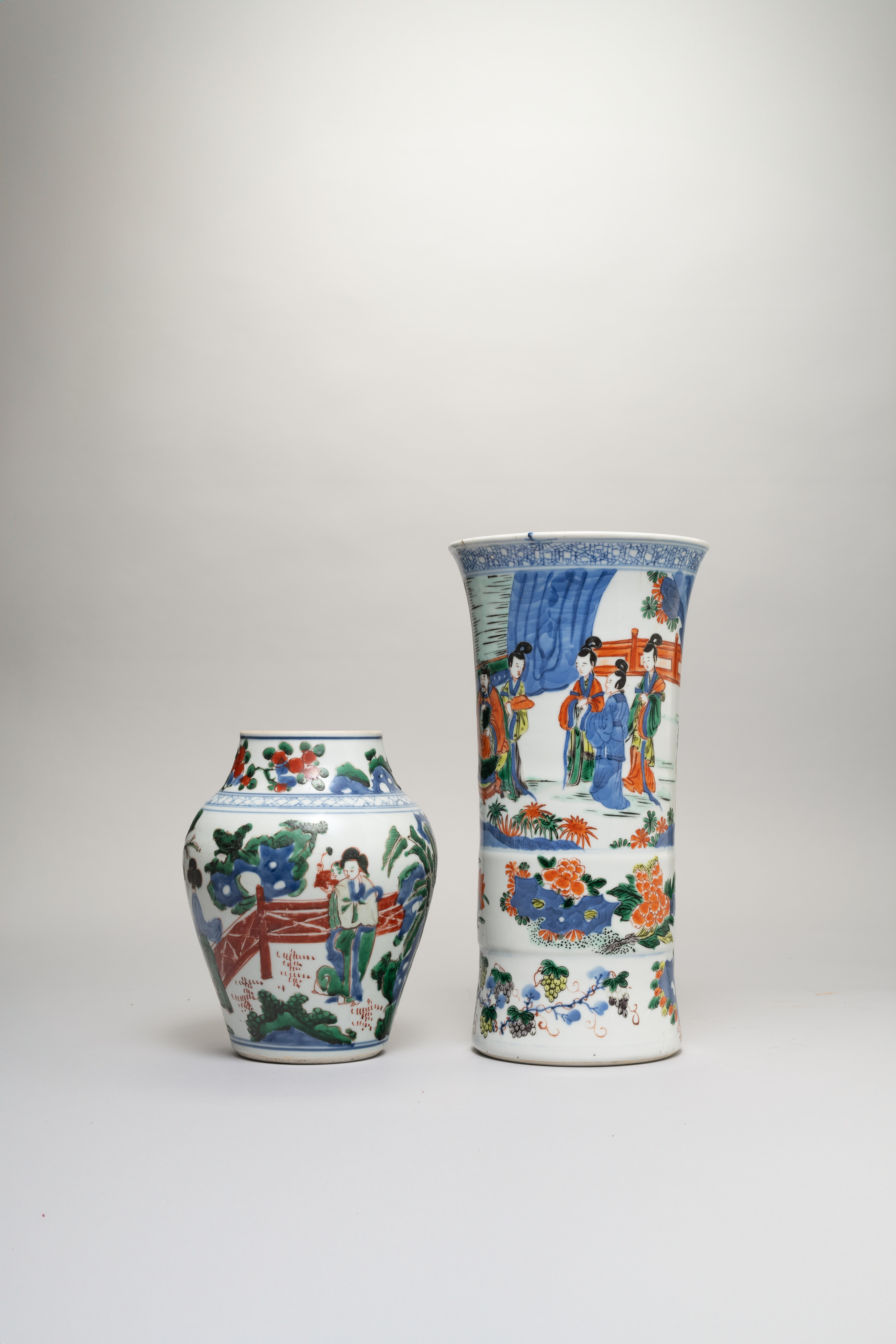 The smaller vase painted with two mothers with their children in the garden, the other vase with a dignitary and his attendants, the base with a six character Wanli mark, 19cm and 30cm. (2)