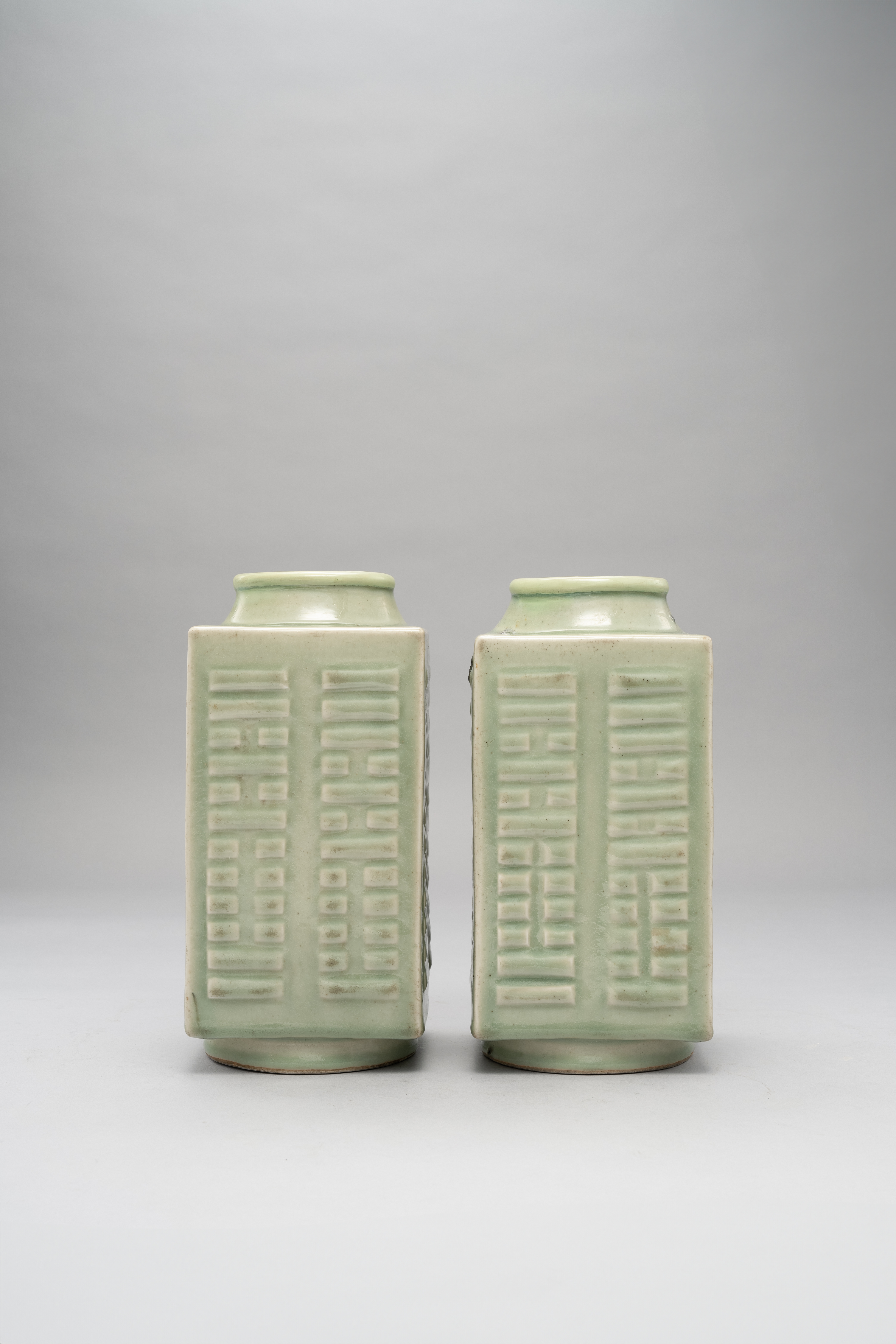 A PAIR OF CHINESE CELADON GLAZED CONG VASES