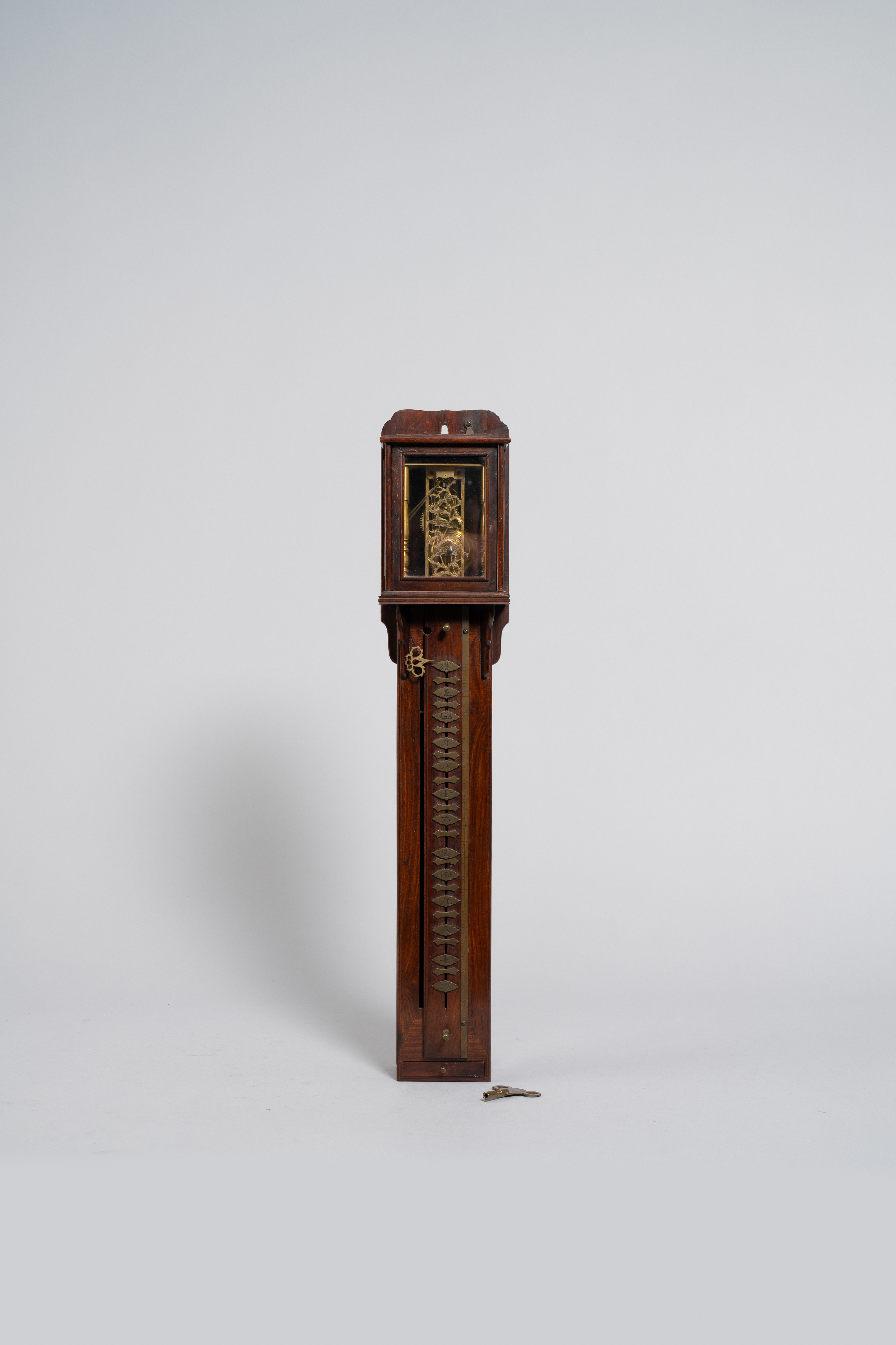Of tall rectangular shape, the weight-driven movement visible at the top and embellished with reticulated floral designs, the wood frame with brass plaques inscribed with numerals at the front, a small rectangular drawer below; together with an associated English key, 49.6cm. (2)