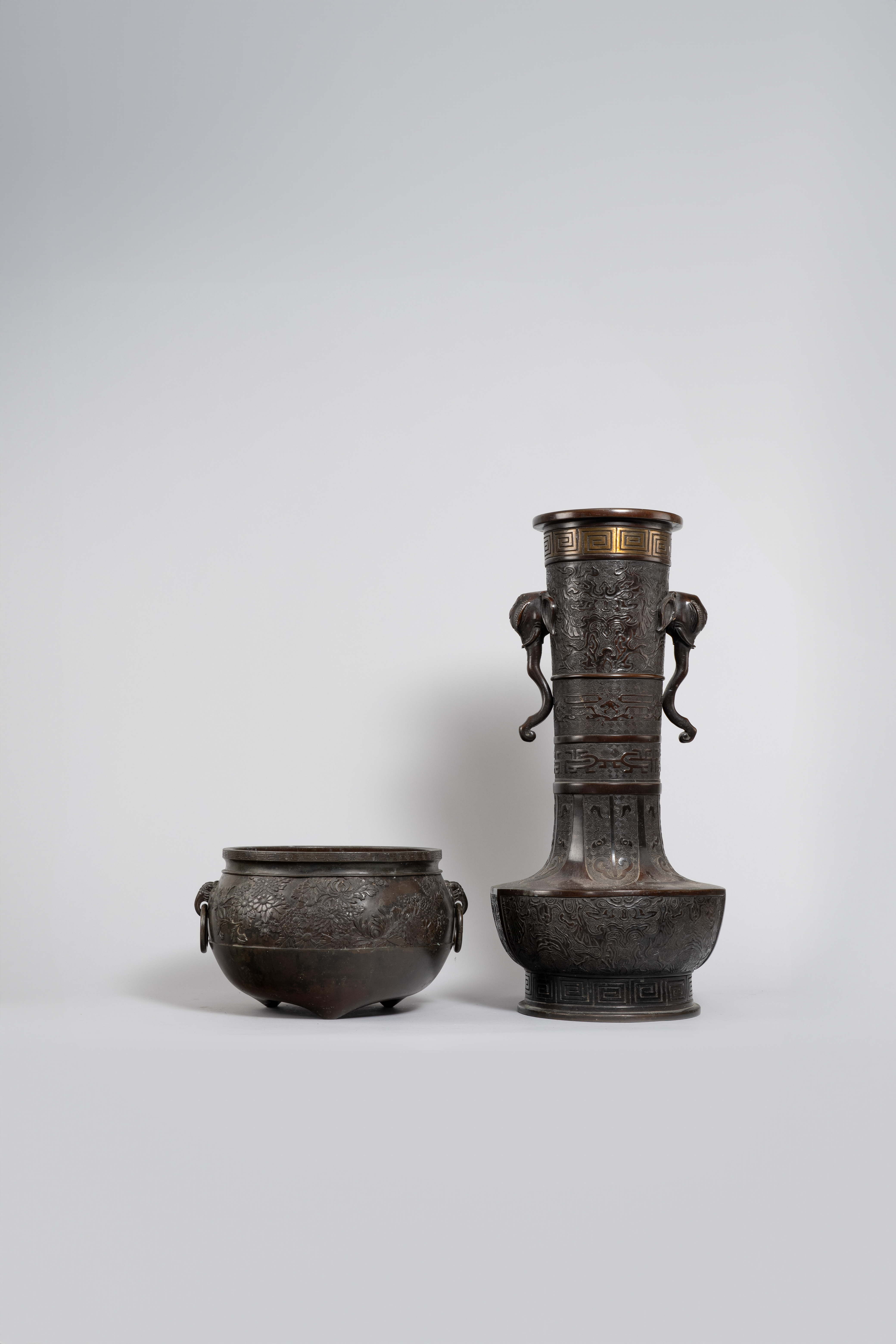 The tall neck issuing from the squat body and with elephant-head handles, the surface embellished with taotie masks, a parcel-gilt band of key fret and other archaistic patterns, the base with a four-character mark; the circular jardinière with a band of flowerheads and two lion masks suspending loose rings; 61.5cm and 27.5cm respectively. (2)