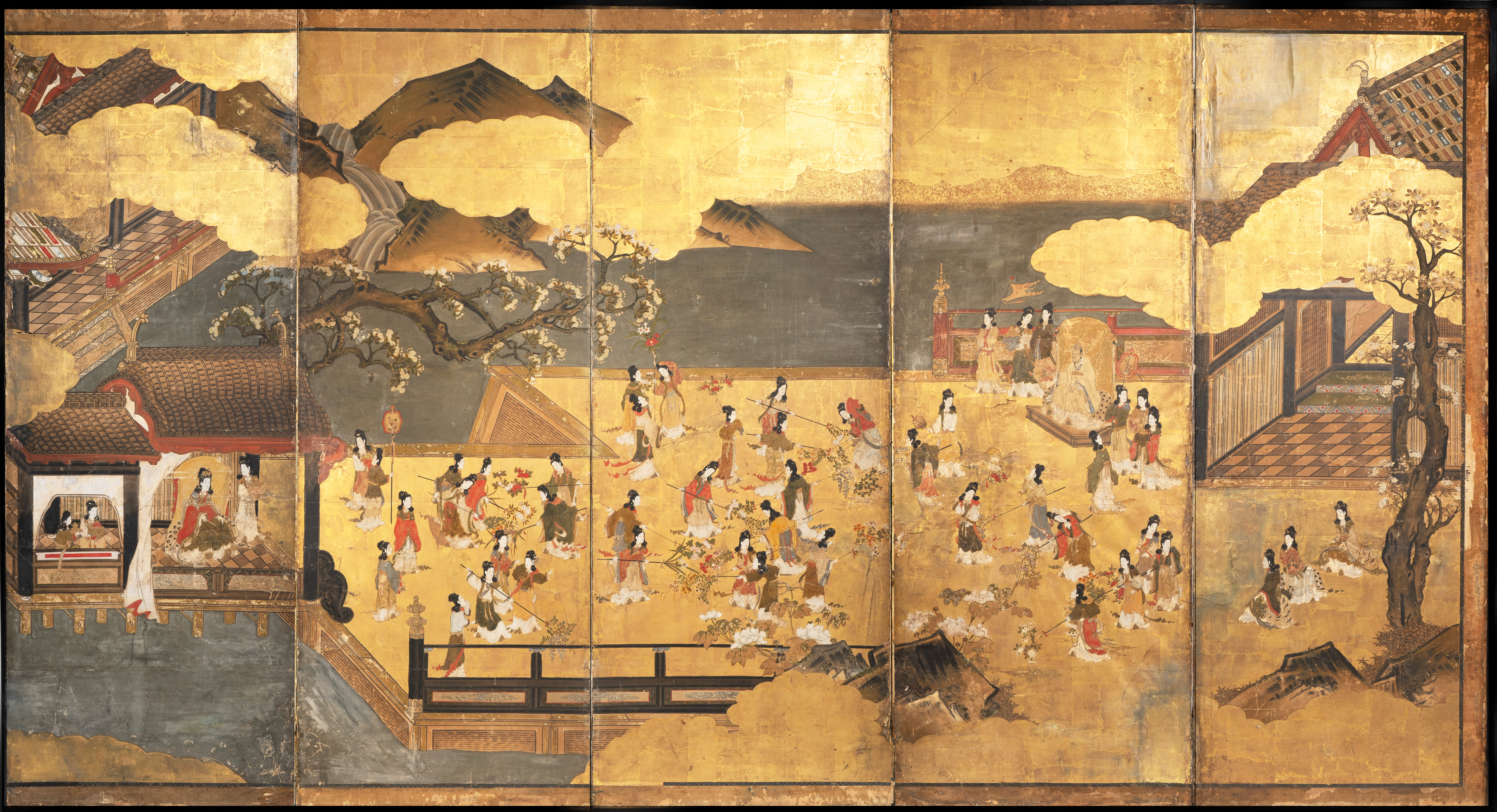 A Japanese five-fold byobu (paper screen), lavishly painted in ink, colour, and gold leaf on paper; embellished with the Chinese Imperial couple watching court ladies fencing with bouquets of flowers attached to long poles, the Emperor sat on a throne to the right of the composition and the Empress depicted in a pavilion on the left, both with attendants carrying goods; the courtyard and pavilions by a lake and with a waterfall flowing down a mountainous outcrop in the distance, with gold clouds above; 169.5cm x 315cm overall.