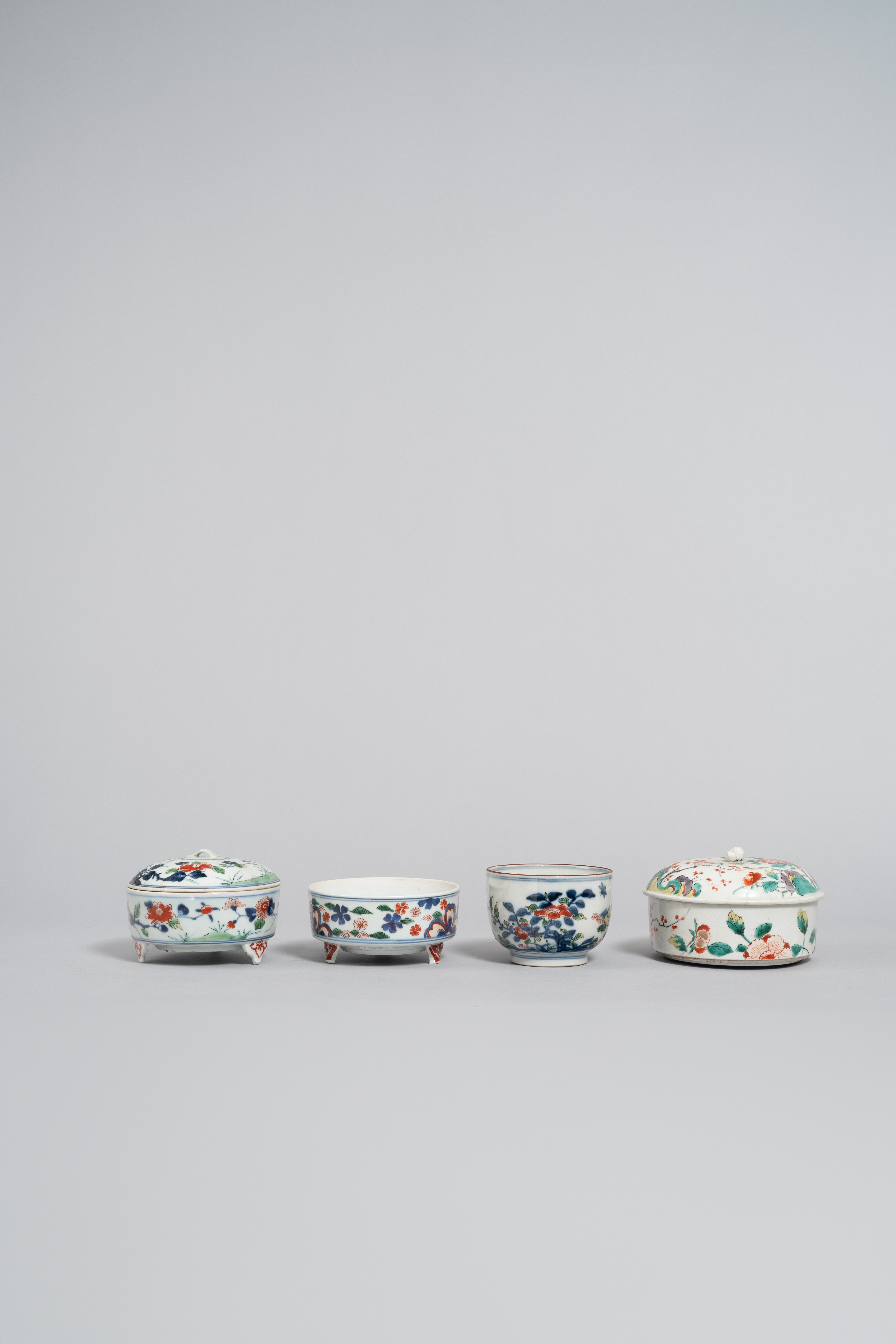 All variously decorated in underglaze blue and polychrome enamels with floral designs, including two tripod boxes and one cover; a single tier from a stacking box and its cover, with a gourd-shaped finial; and a footed bowl, a four-character mark underneath, 14.5cm max. (6)