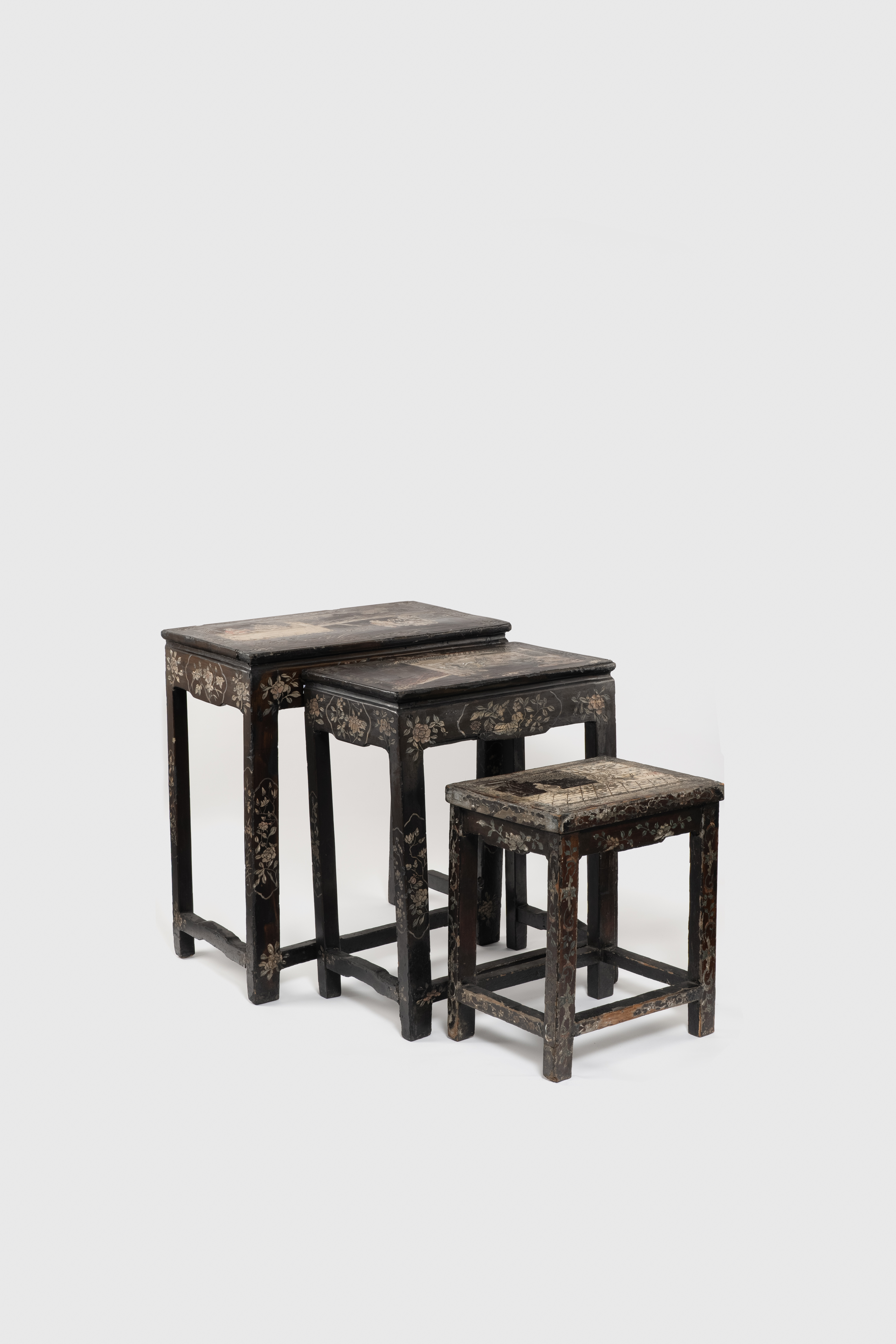 With rectangular tops, decorated with figures in gardens and with flowers and foliage, 68.5cm x 62cm x 37cm max. (3)