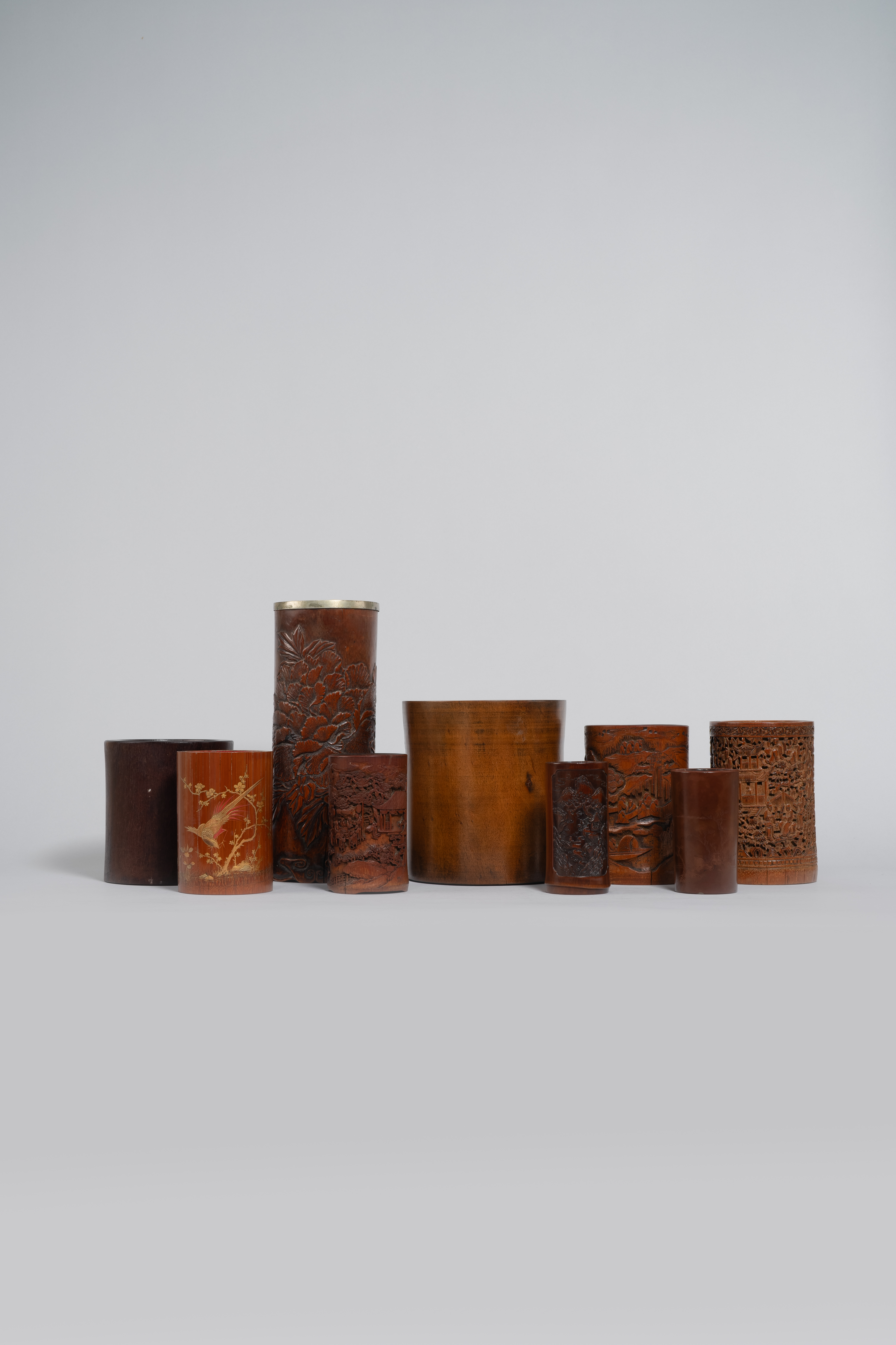 Comprising: two large cylindrical bitong in hardwood, another lacquered brown and incised with a landscape scene and six in bamboo, 29.5cm. (9)