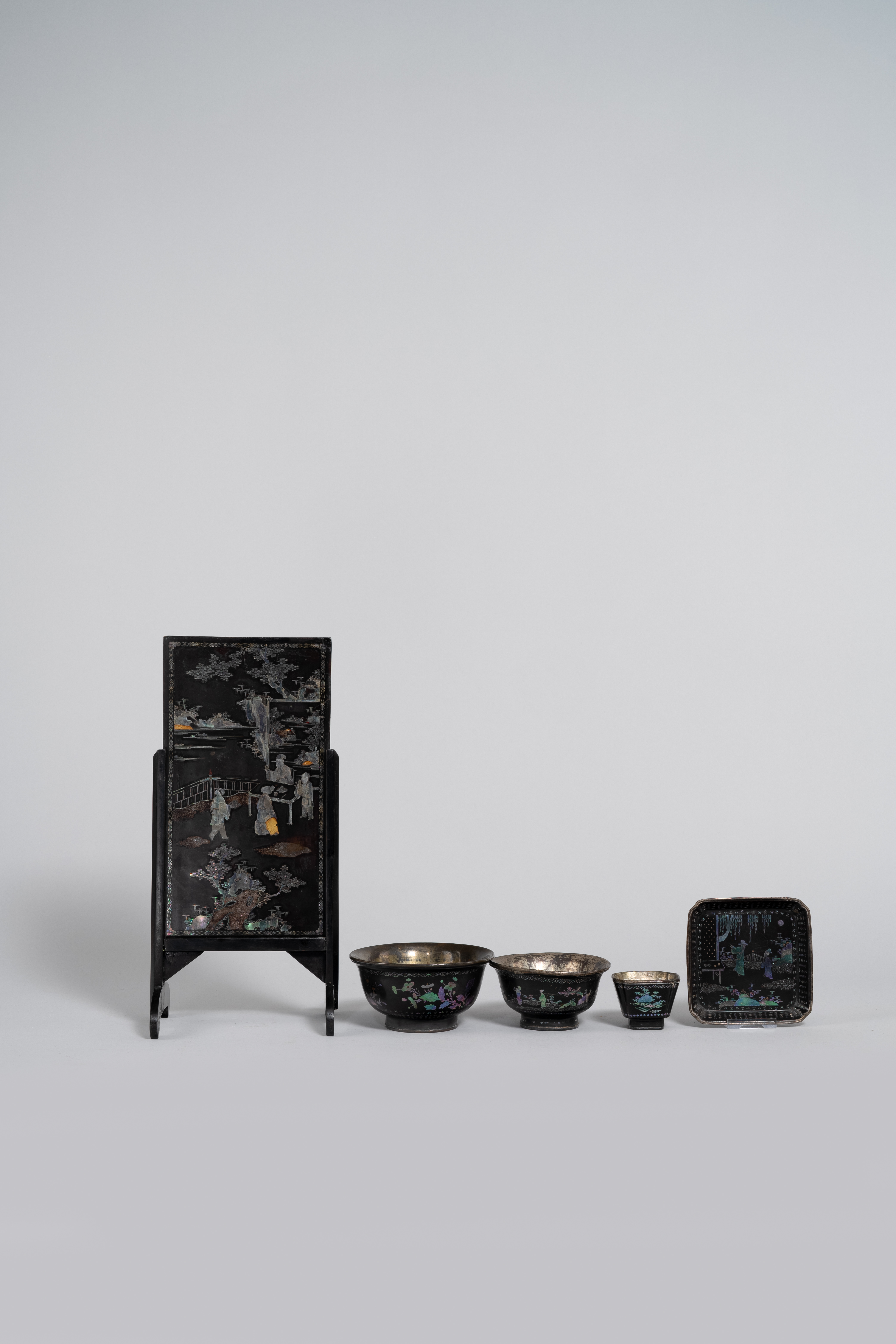 All items in black lacquer with decoration rendered in mother of pearl; comprising: a table screen and stand, embellished with scholars having tea in a mountainous river landscape to one side, and lines of calligraphy to the other; a small square-section dish, and three bowls of various sizes, all decorated with further figures and flowers, 32.2cm max. (6)