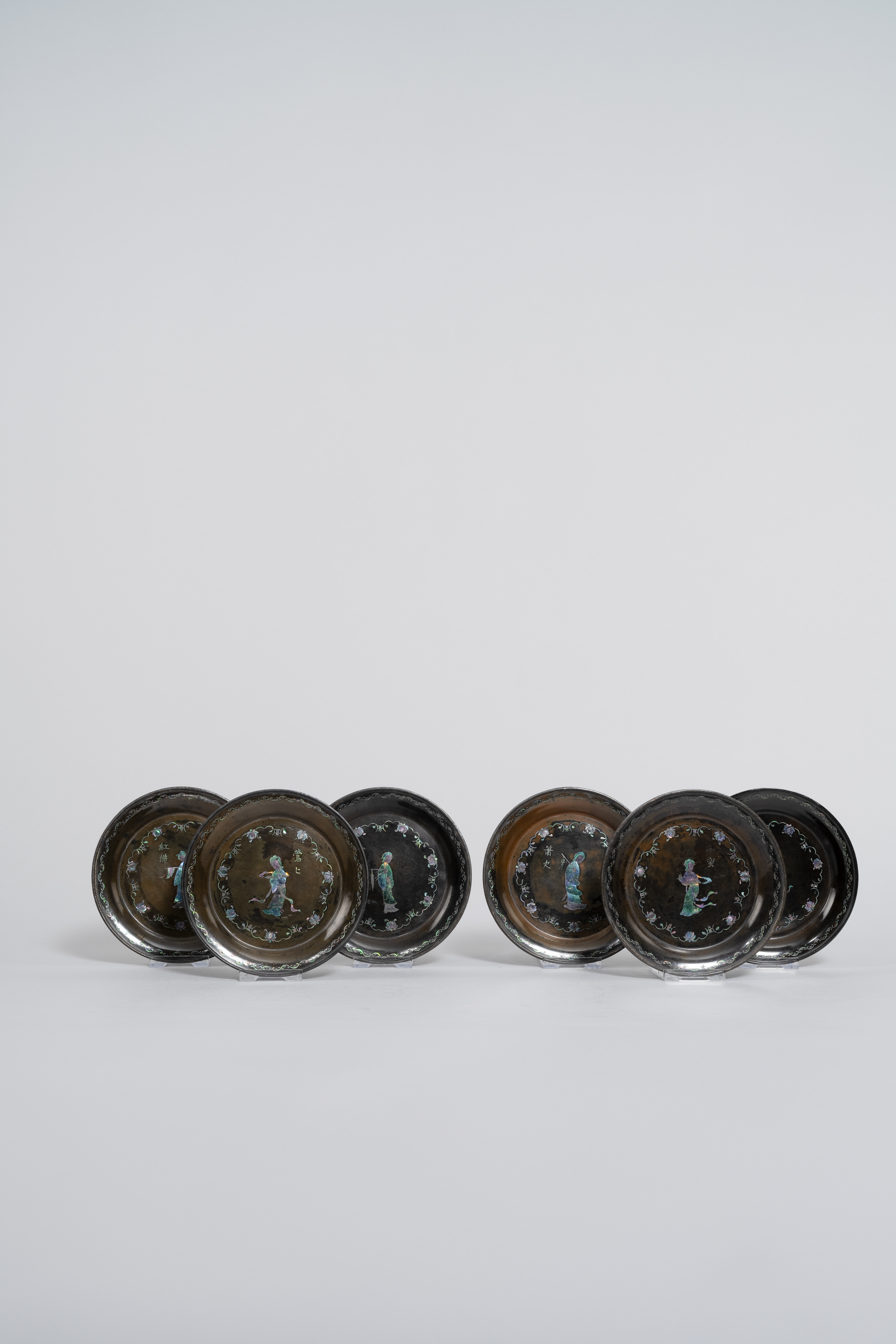 Each decorated in mother of pearl with a single standing female figure, within flowers and scrolls, all on a dark brown lacquer ground; each dish inscribed; 12.5cm. (6)