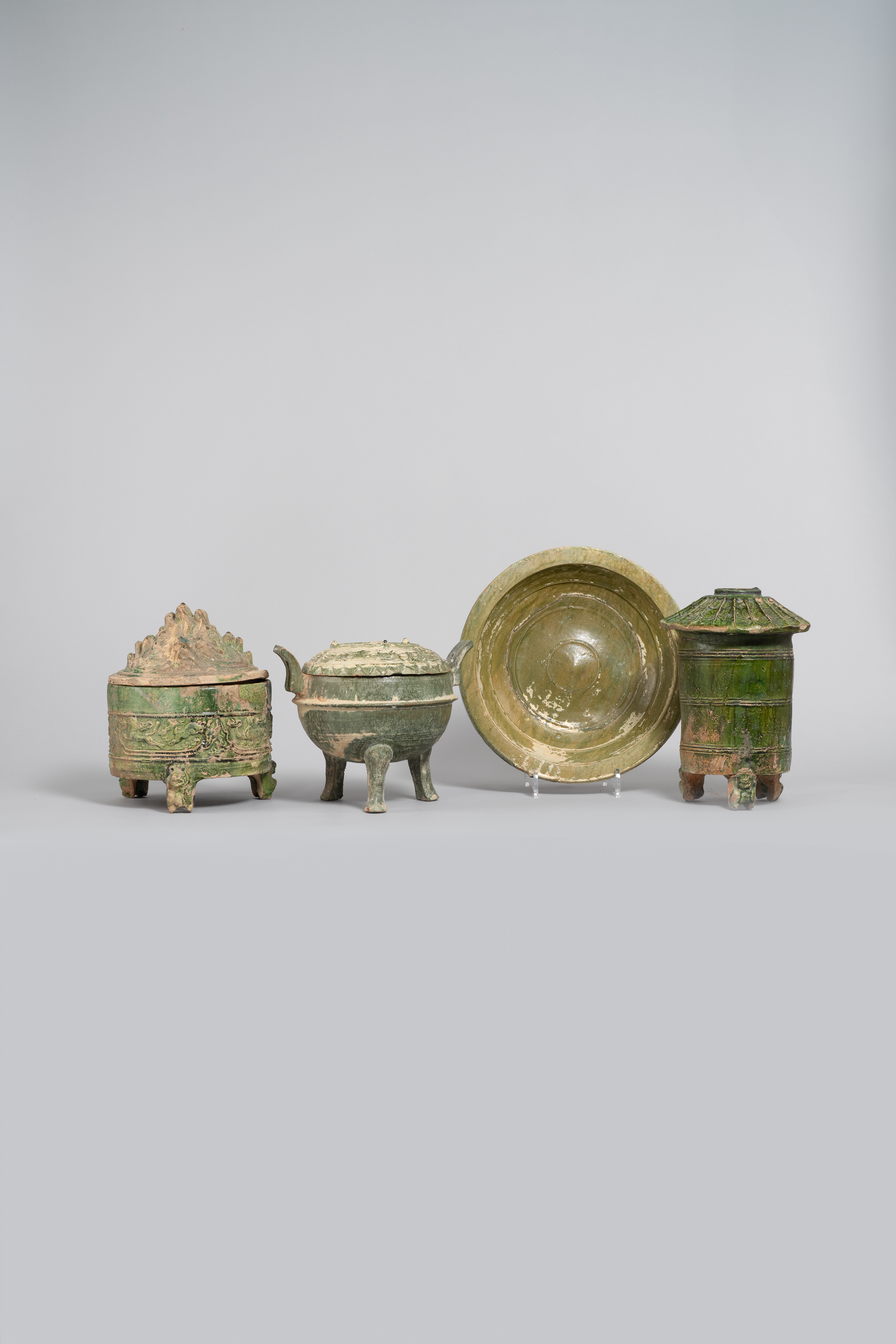 Comprising: a hill censer, a model of a grain silo, a circular incense burner and cover, and a shallow bowl, 30cm max. (6)
