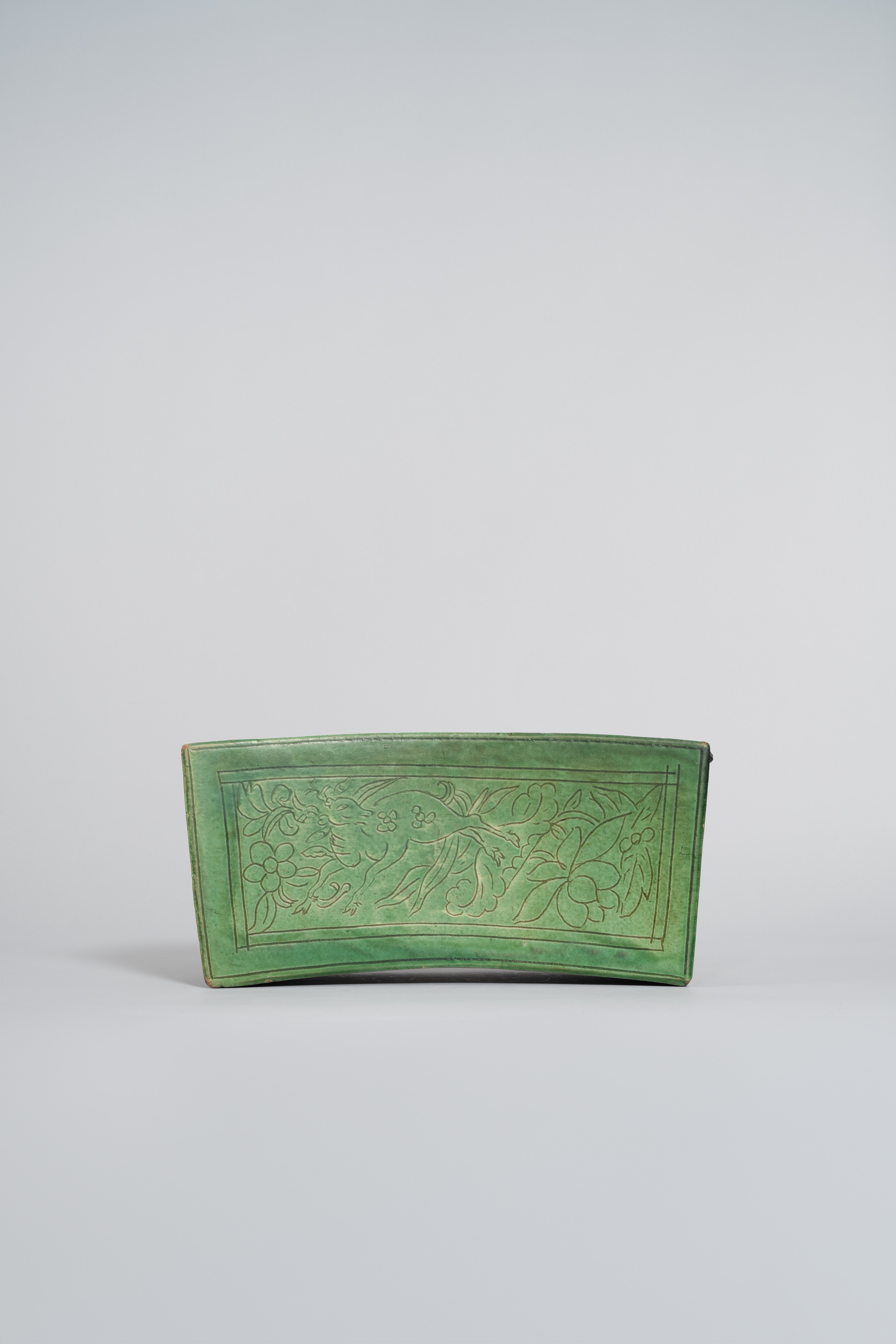 The upper part of the rectangular body decorated with an unctuous green glaze, incised with a panel enclosing a deer prancing amongst foliage, lotus and other flowers, a paper label to the unglazed base reading 'OCS 2009, THE WORLD IN MONOCHROMES, NO.16', 11.5cm x 36.5cm x 17cm.