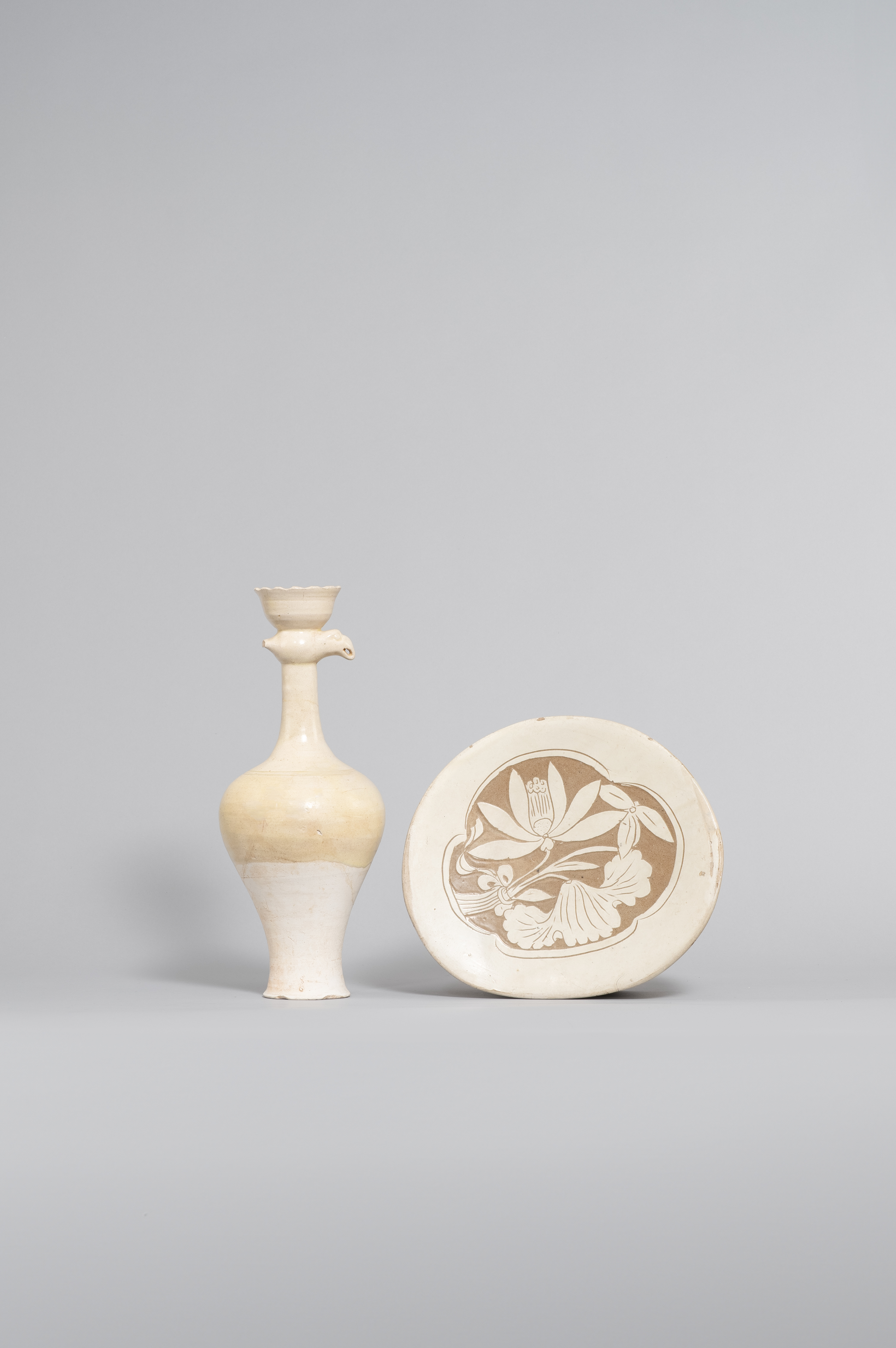 The upper section of the tall pouring vessel covered in a creamy-white glaze, the spout modelled as a stylised bird and topped with a foliate cup; the pillow covered in an ivory-coloured slip incised with a lotus flower and leaves tied up with a ribbon, 34cm max. (2)
