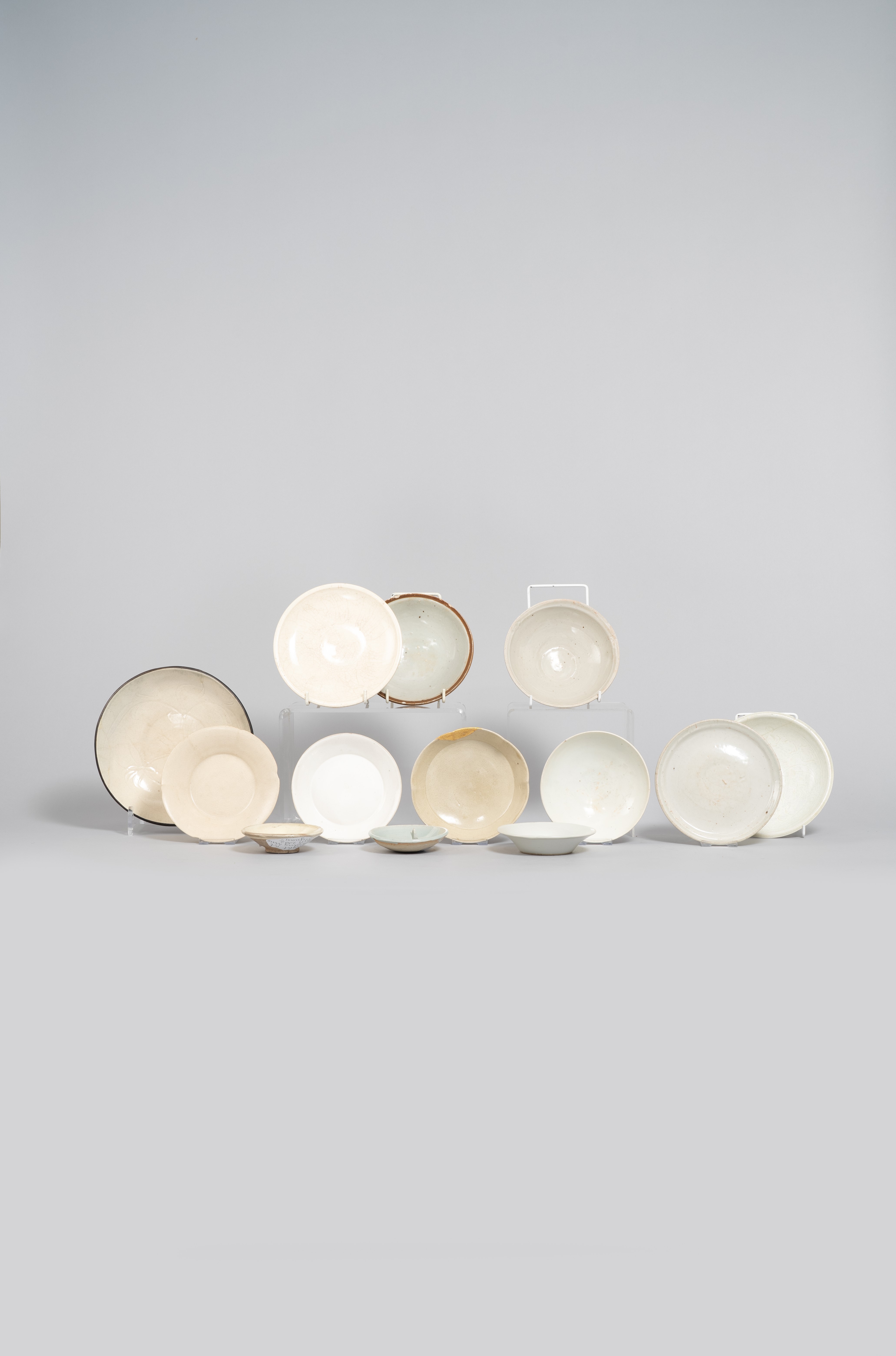 Comprising: two dishes with incised decoration, a small dish applied with a fish to the rim, and ten further dishes, 19cm max. (13)