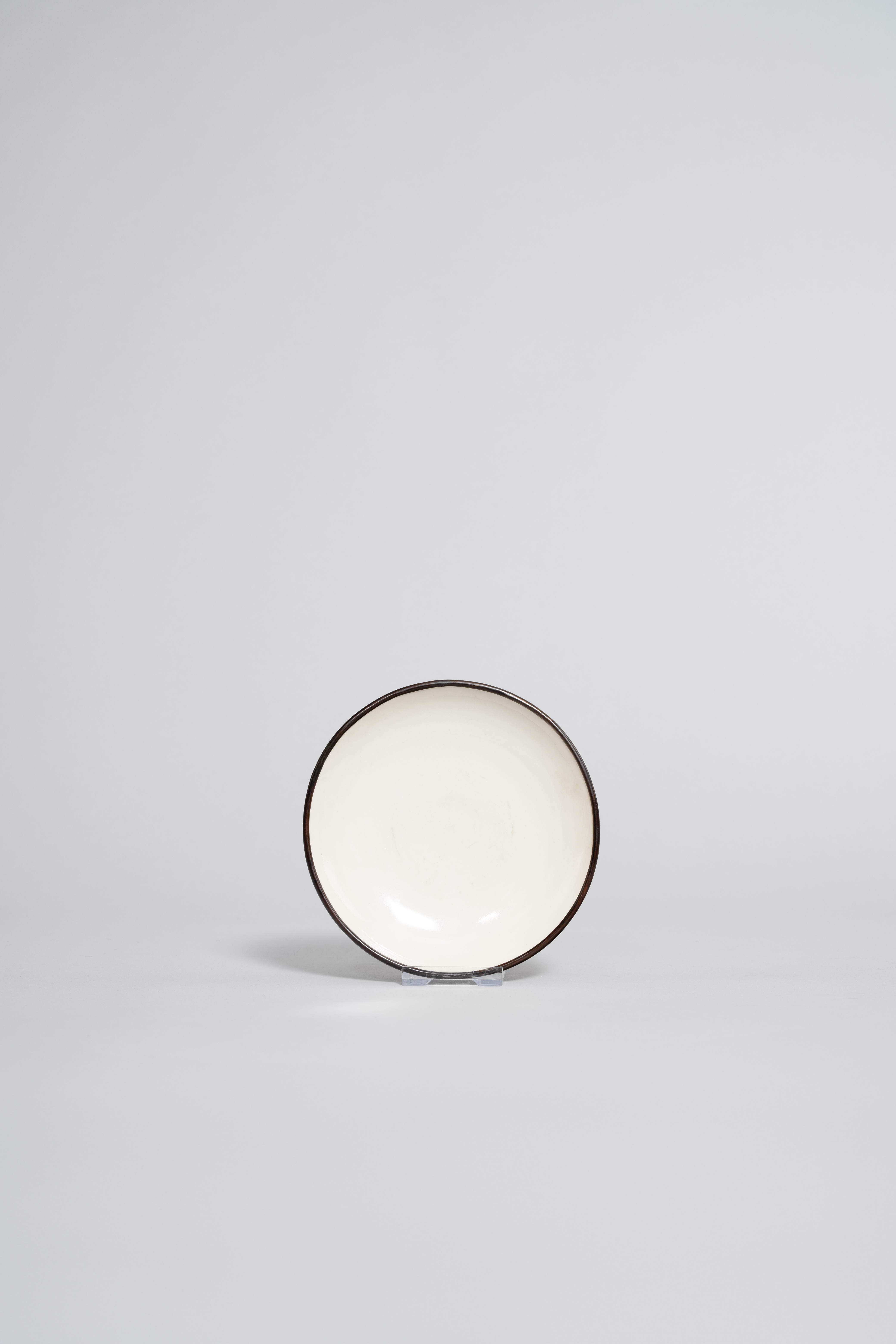 Covered in a lustrous creamy-white glaze and with a copper rim, raised on a short foot and the base incised with the character guan; a paper label to the side reading 'OCS 2009, THE WORLD IN MONOCHROMES, NO.105', 12.4cm.