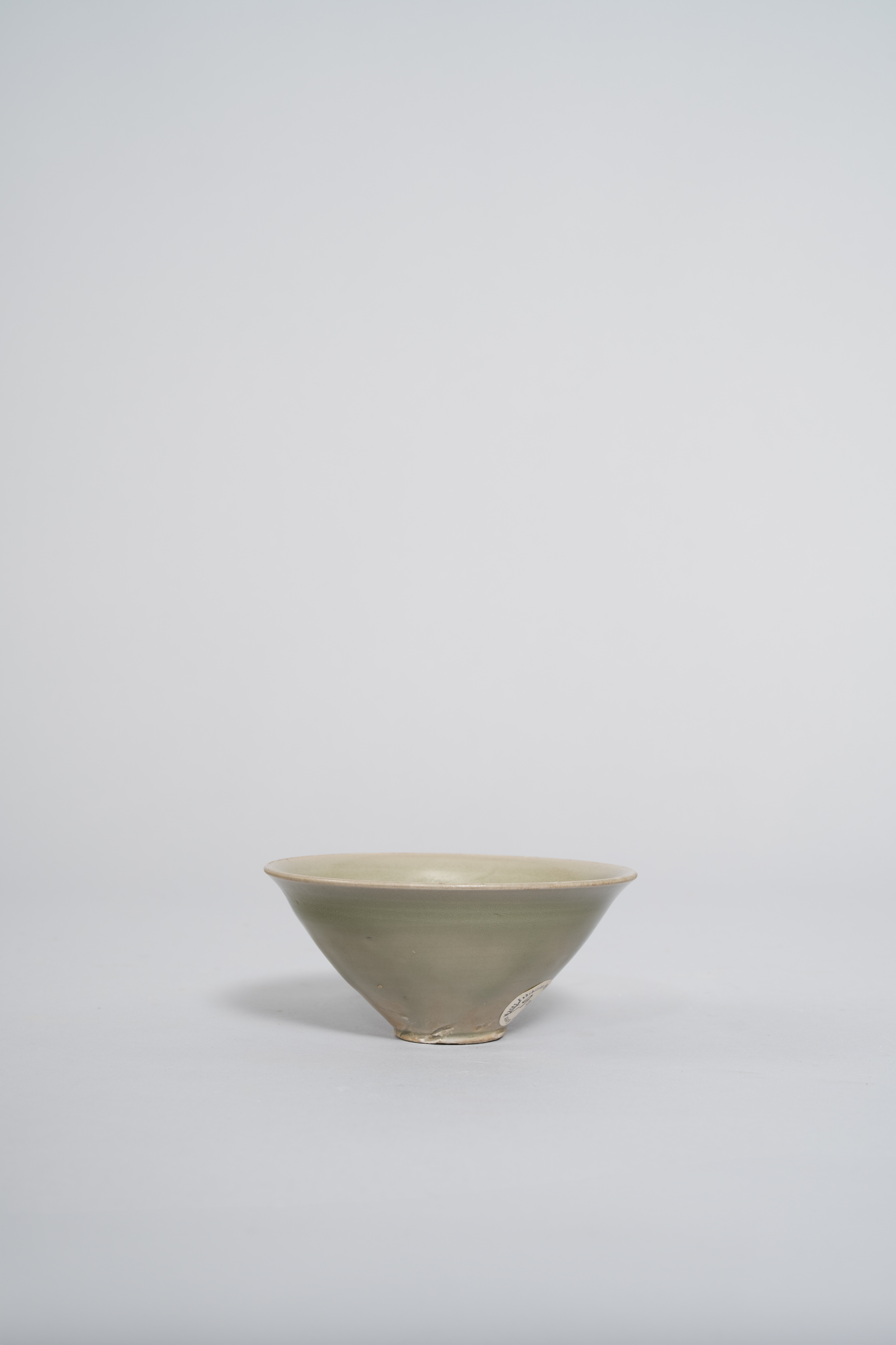 The deep conical body covered in a lustrous olive-green glaze, raised on a short unglazed foot, with a paper label reading 'BM/OCS 1997 Oriental Green Wares Exhibition, no.67', 10.6cm.