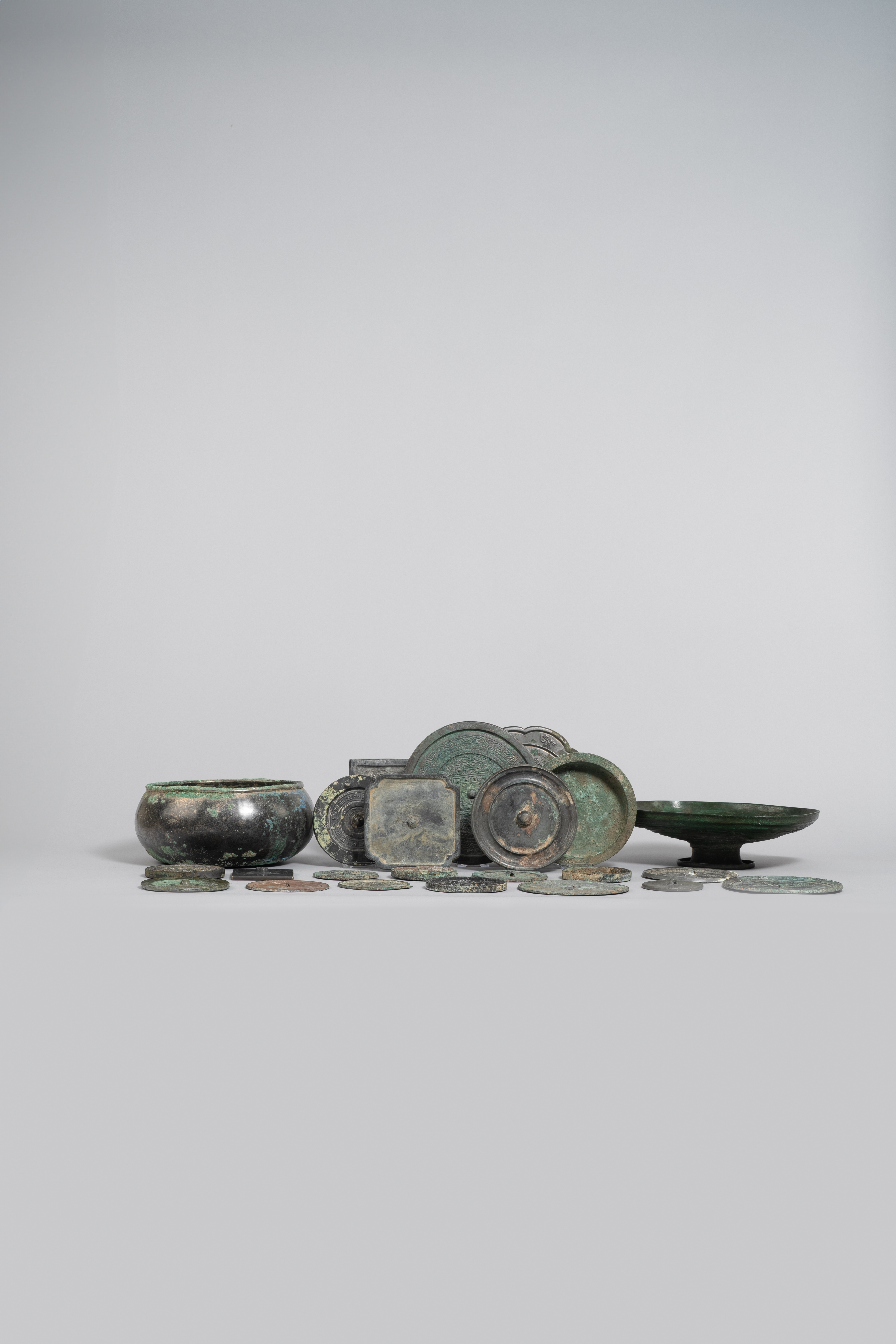 Variously decorated with squirrels, birds, fish, and geometric designs, together with a bronze bowl, a dish and a cover, 26.5cm max. (23)